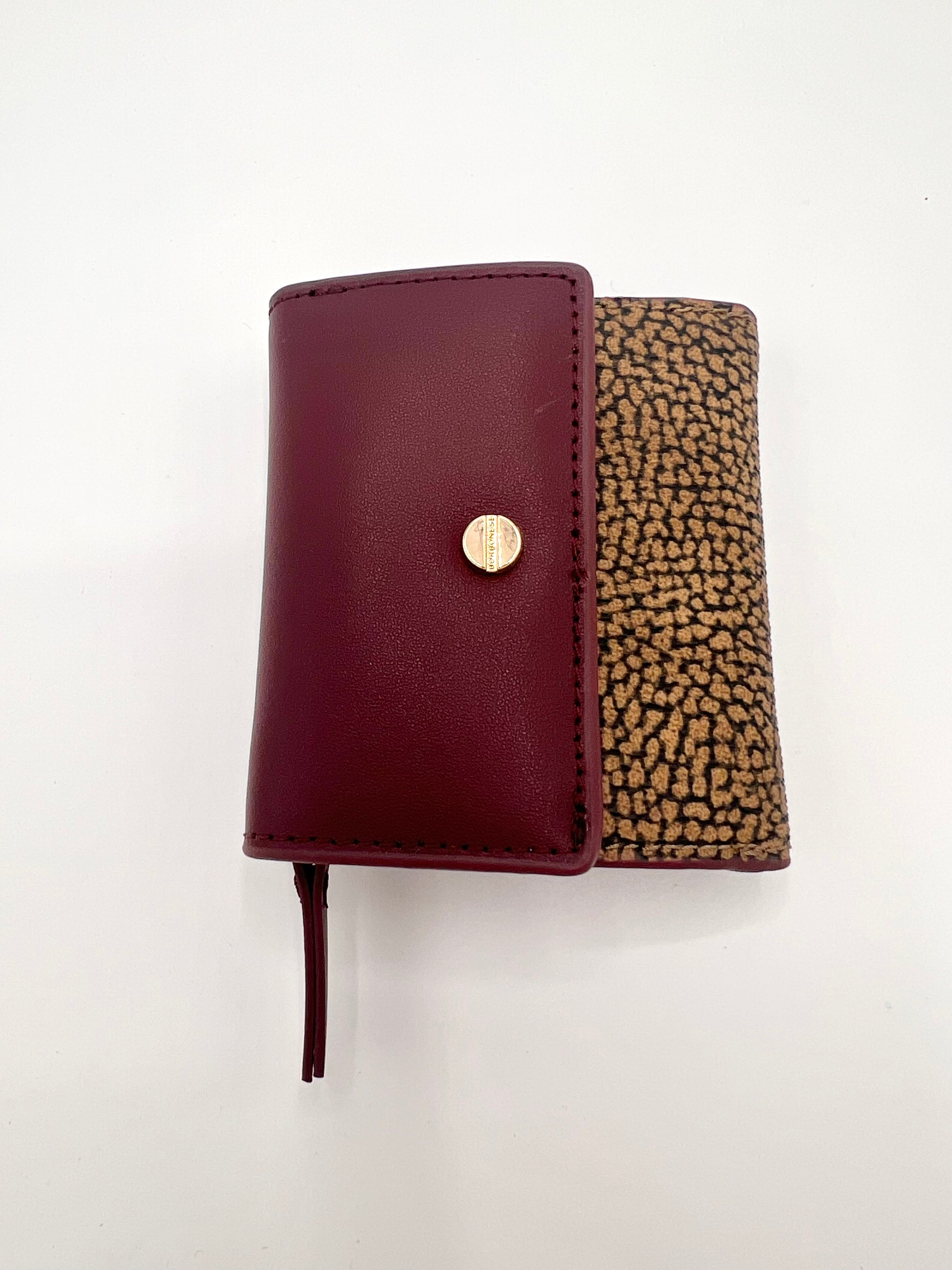Portafoglio mini realizzato in tela OP. Chiusura con bottone a perssione logato. Interno foderato in tessuto jacquard con schermo anti-clonazione carte. Scomparto per i contanti. Sei scomparti portatessere. Scomparto per le monete con chiusura zip. Metallerie oro.