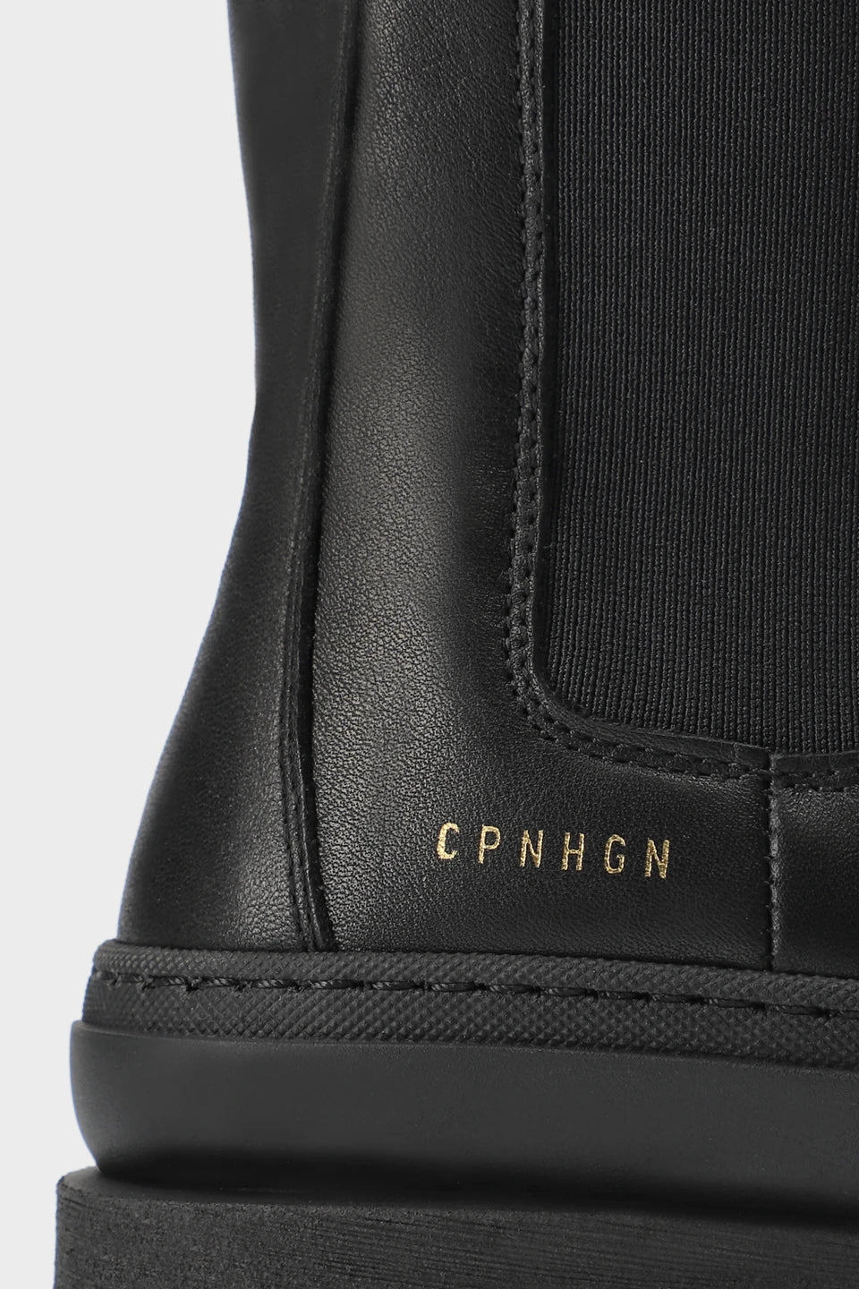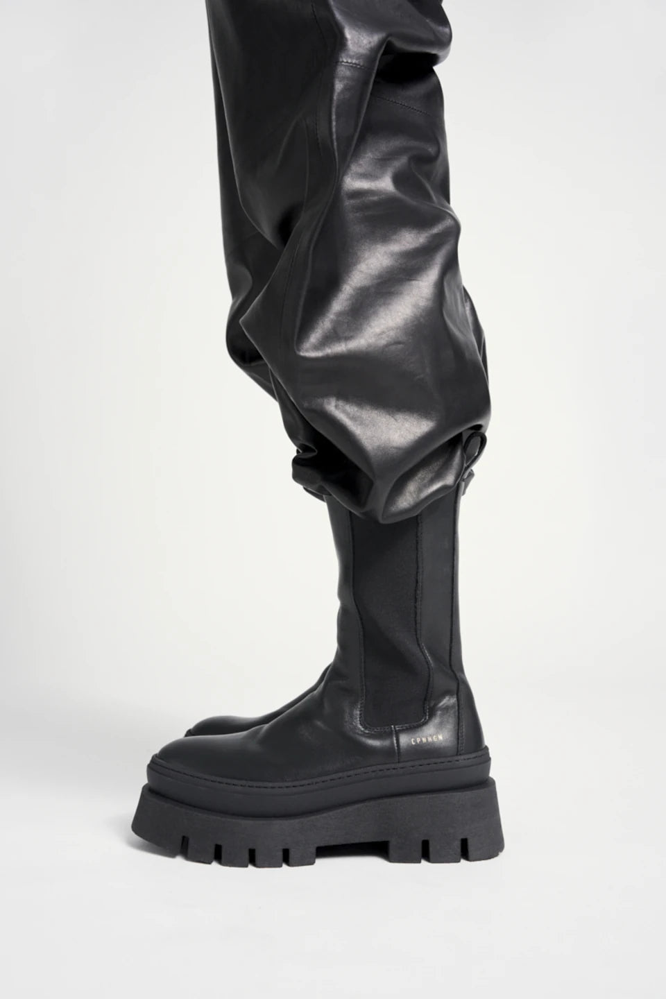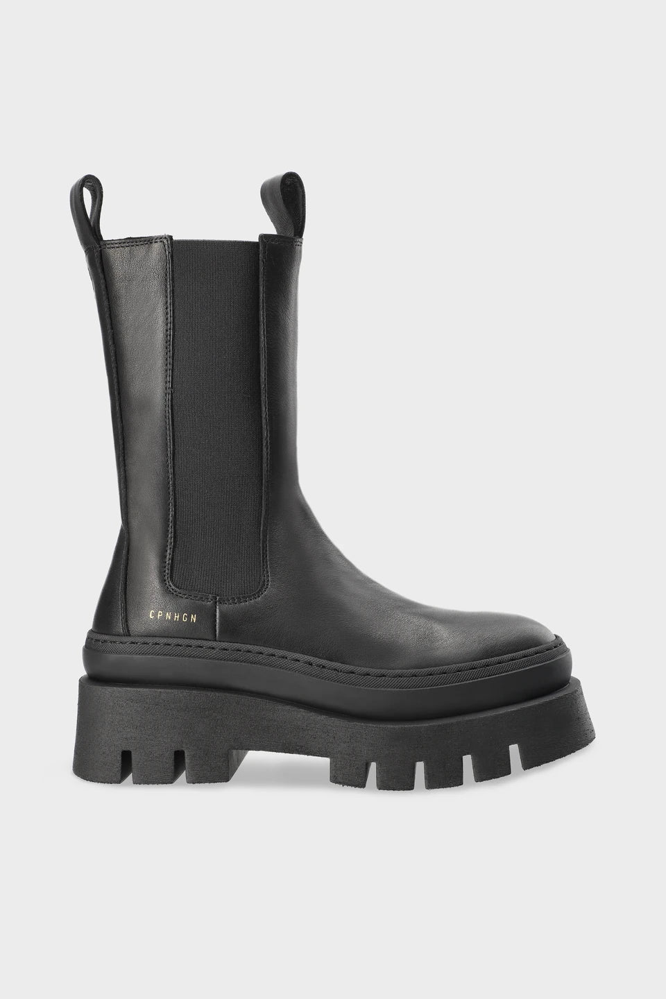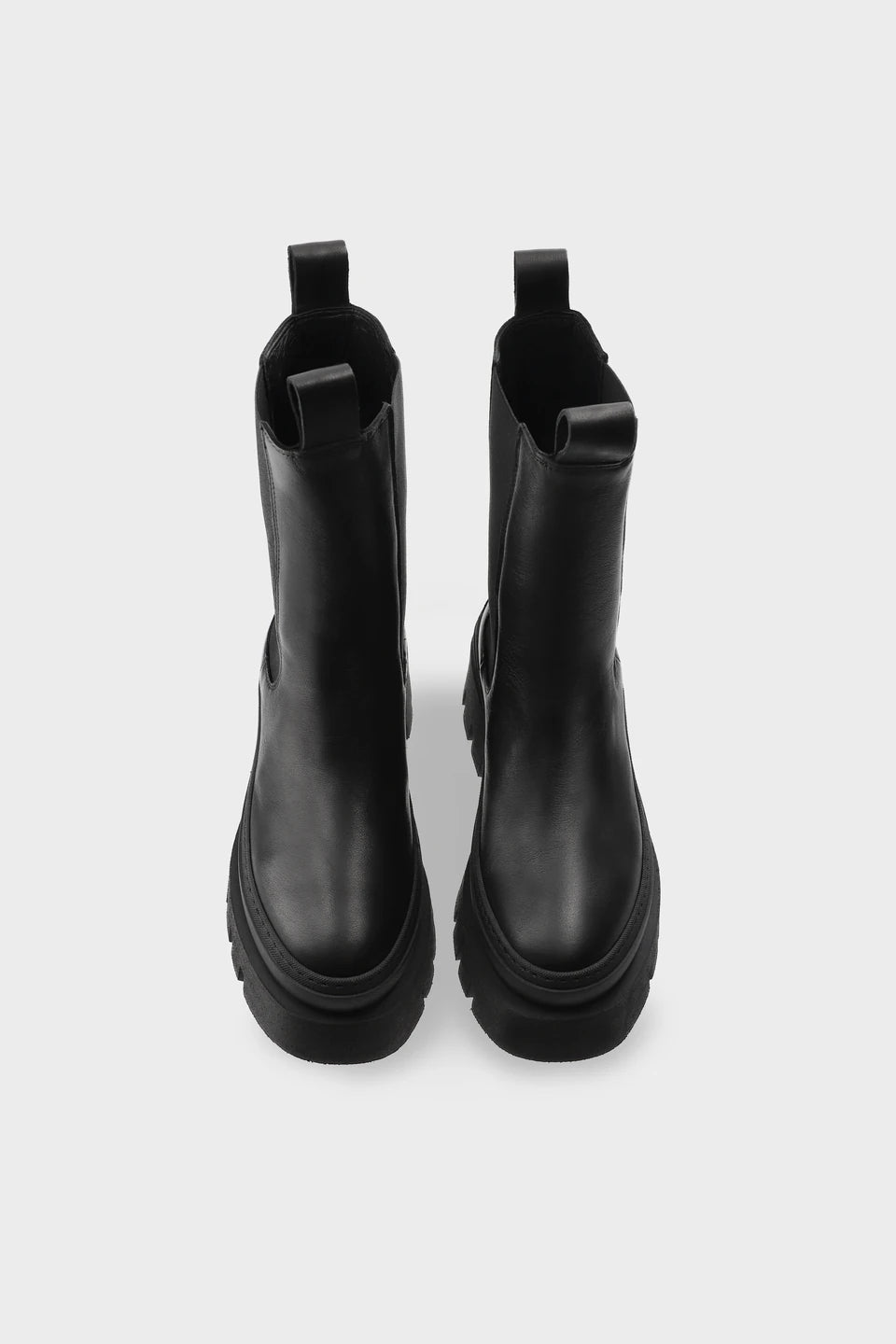 Stivaletti boots realizzati in pelle liscia. Altezza al polpaccio con inserti alti in elastico. Logo inciso color oro. Punta arrotondata. Plateau alto da 3 a 5 cm colore nero opaco. Calzata regolare.