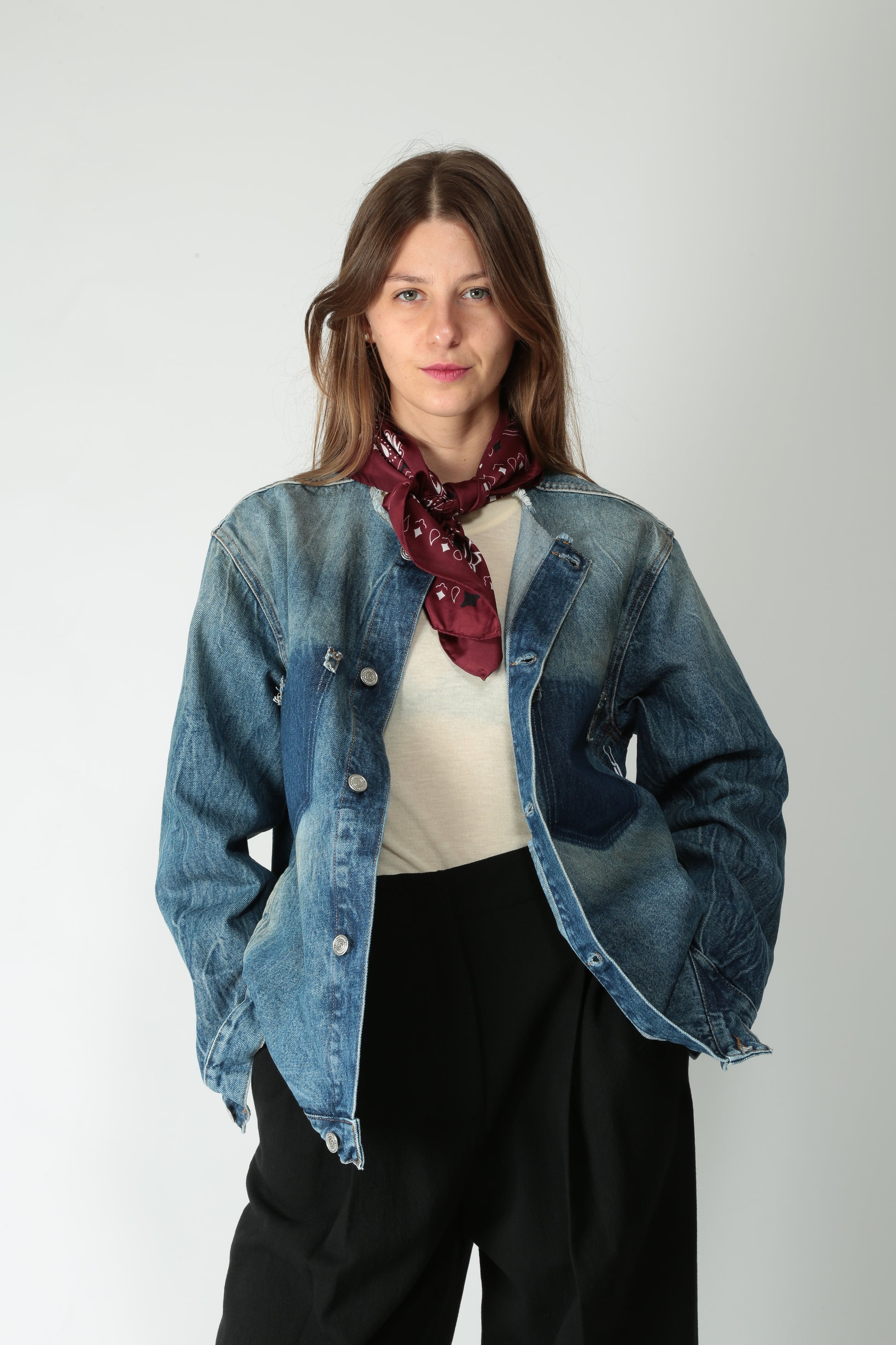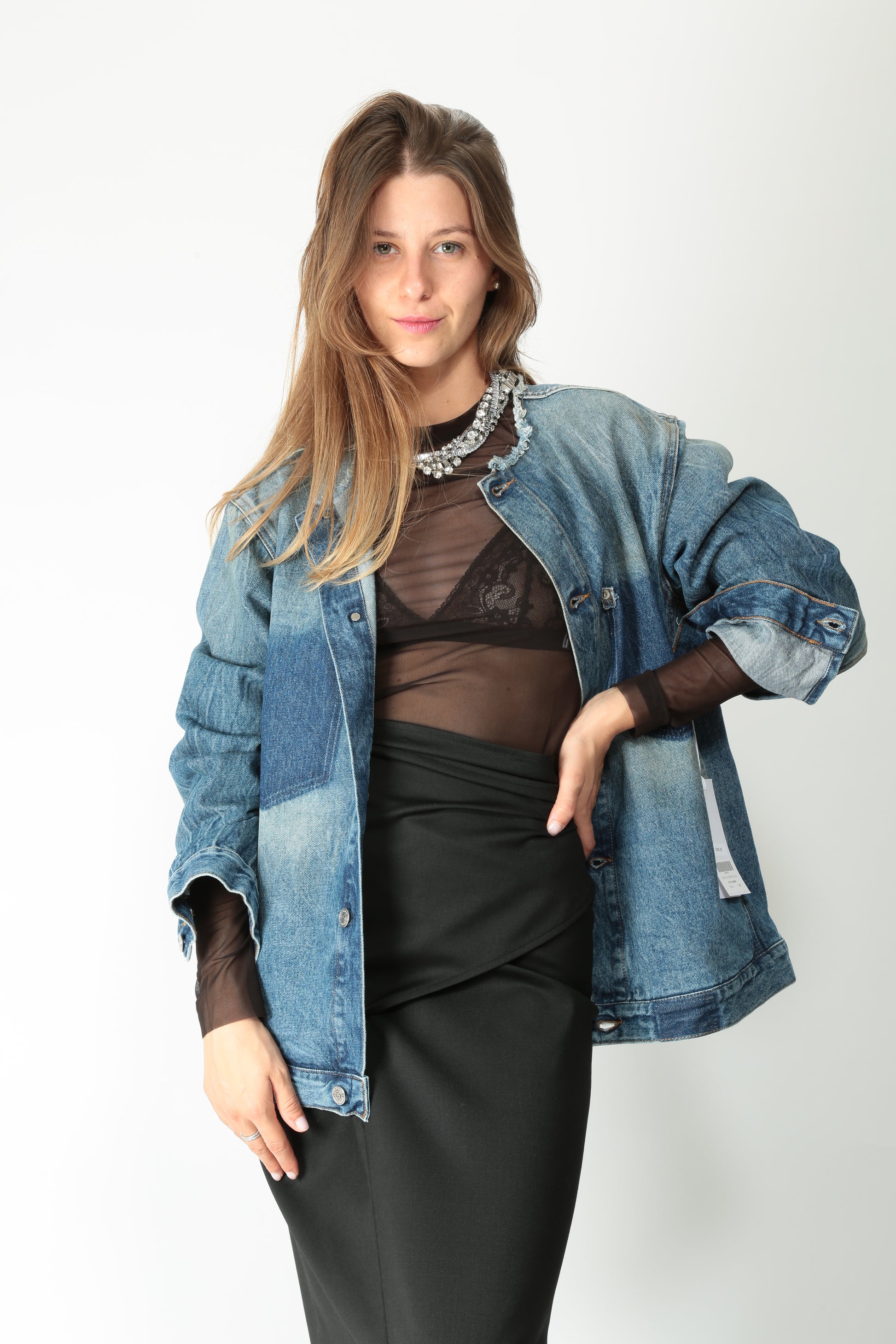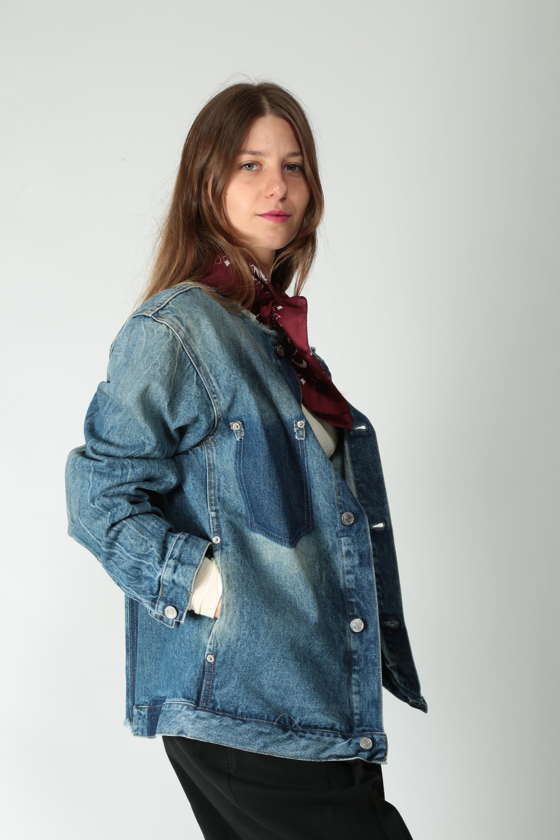 Giubbotto in denim. Girocollo con profilo sfilacciato. Manica lunga. Chiusura con bottoni. Tasche a filetto. Etichetta logo applicata nel centro dietro. Modello dritto. Volume oversize. Scoloriture per un effetto vintage.