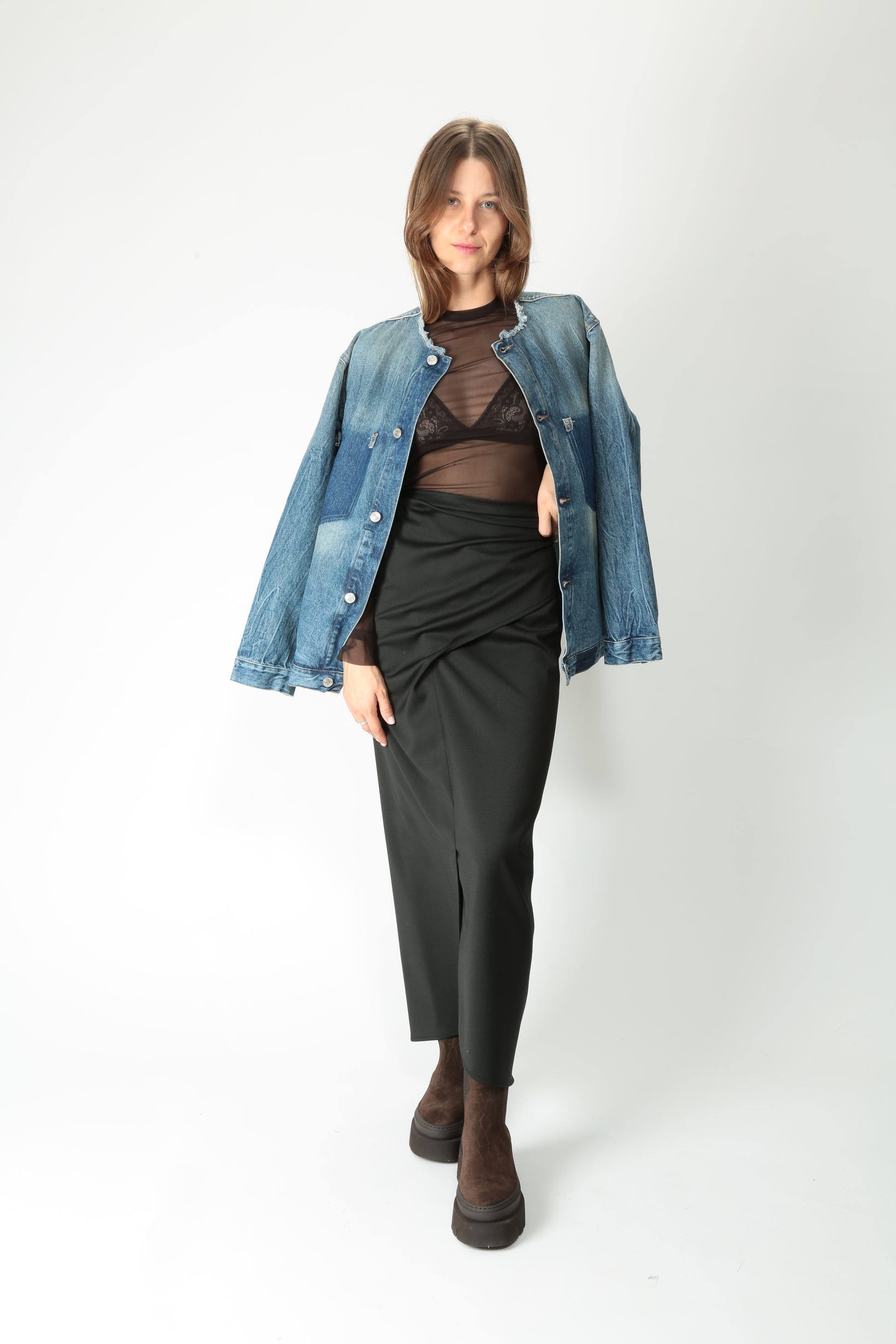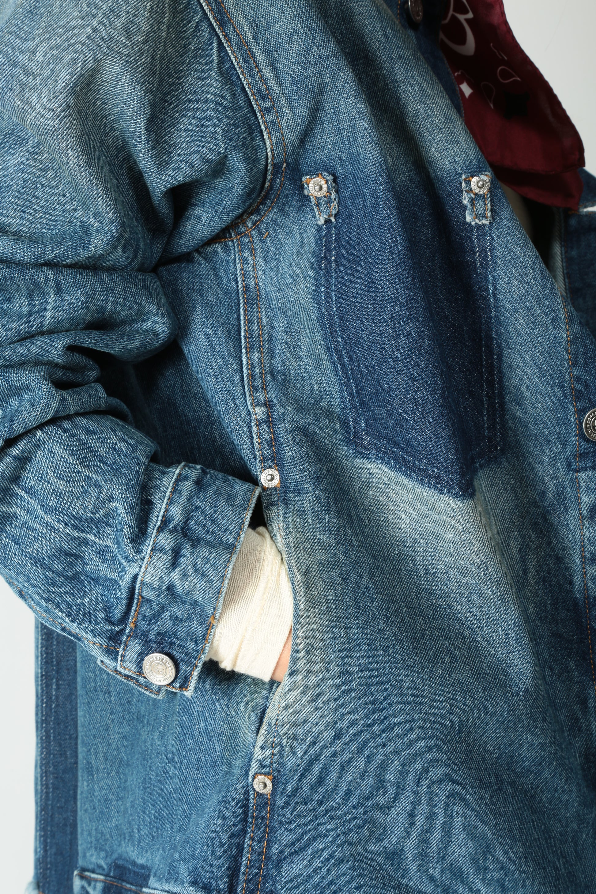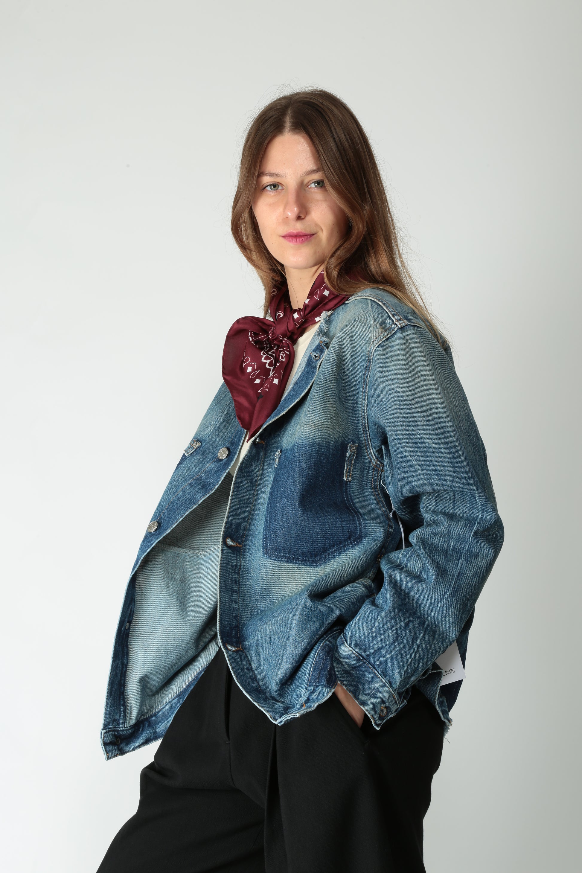 Giubbotto in denim. Girocollo con profilo sfilacciato. Manica lunga. Chiusura con bottoni. Tasche a filetto. Etichetta logo applicata nel centro dietro. Modello dritto. Volume oversize. Scoloriture per un effetto vintage.