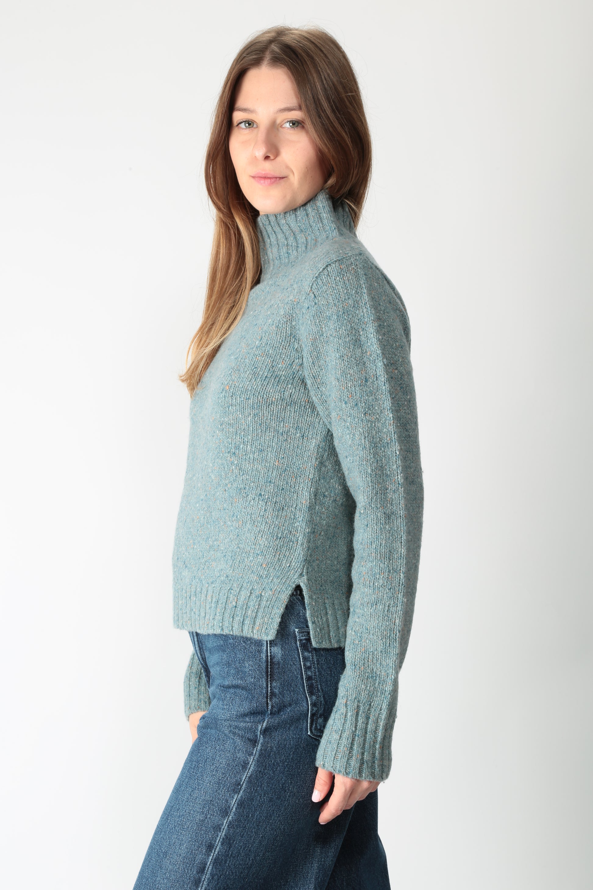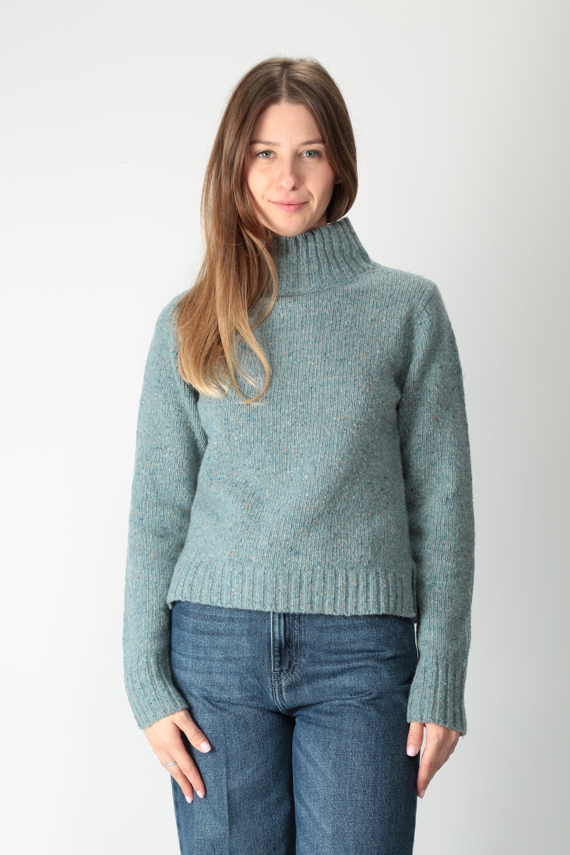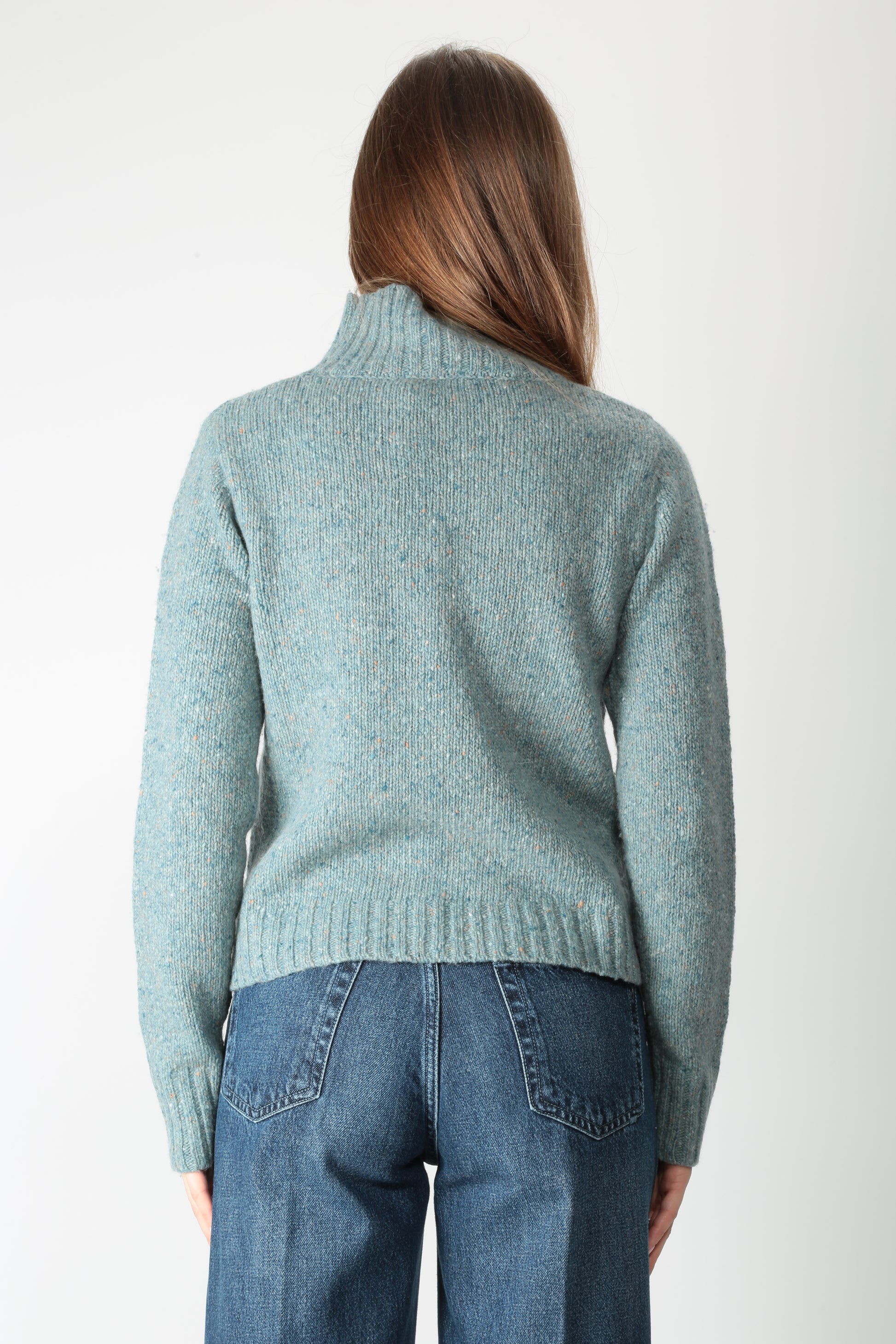 Maglia in misto lana con effetto puntinato. Collo alto. Manica lunga. Una costa rifinisce i bordi. Piccoli spacchi laterali. Volume asciutto. Disponibile anche nel colore salvia.