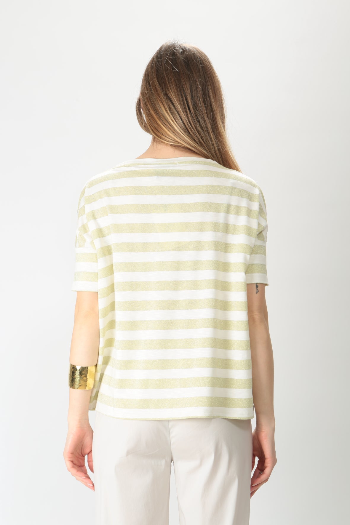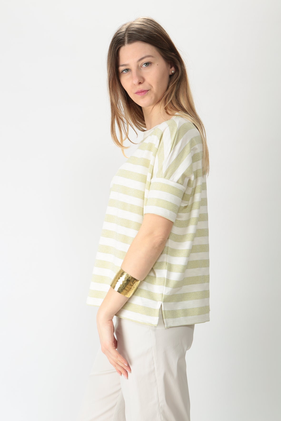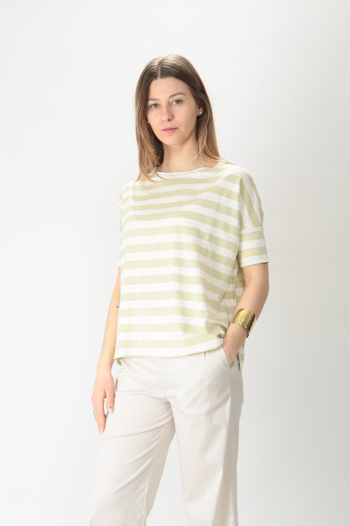 T-shirt in lurex misto viscosa . Spalla scesa. Girocollo. Maniche corte. Volume ampio. Disponibile anche nella variante bianco/blu.