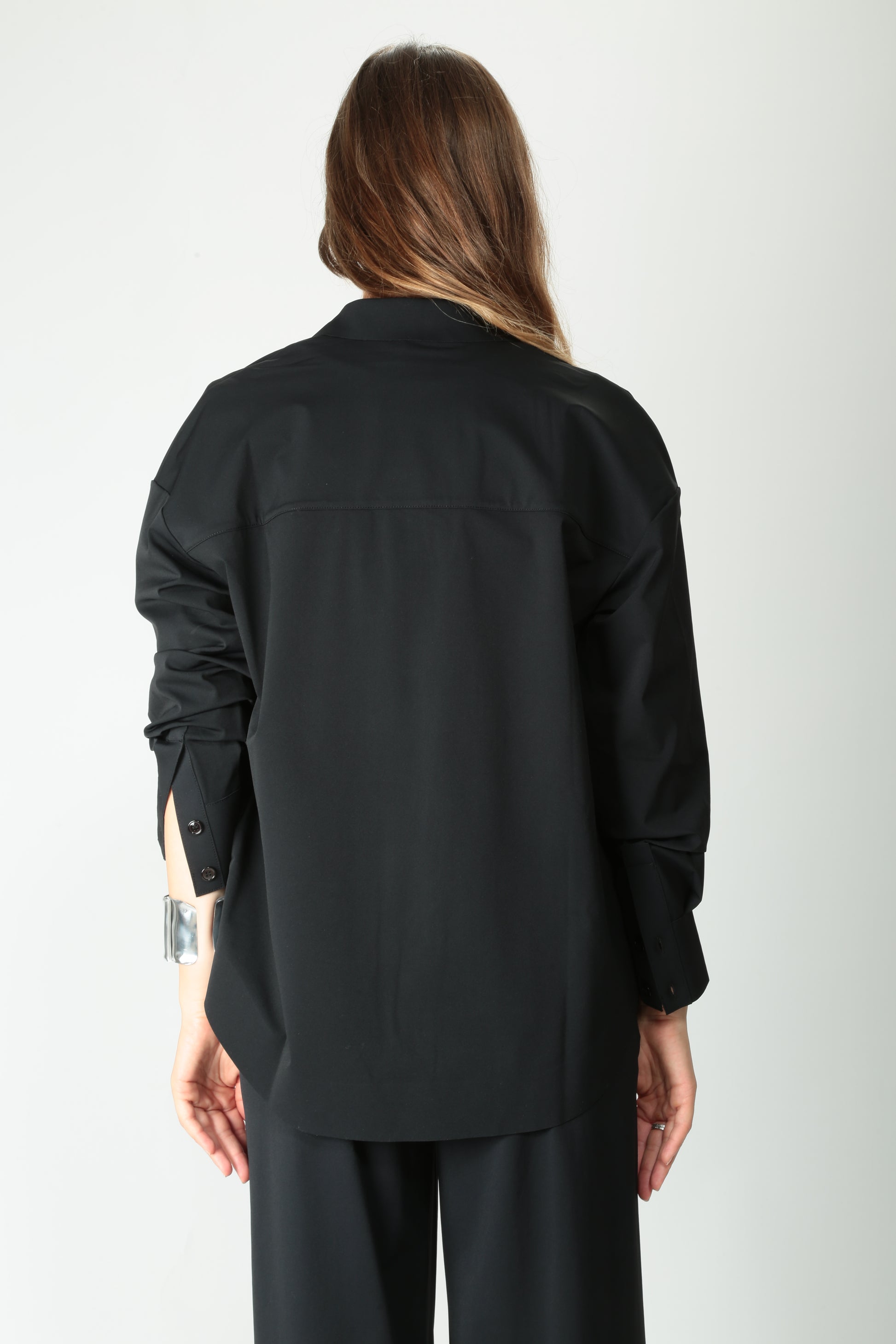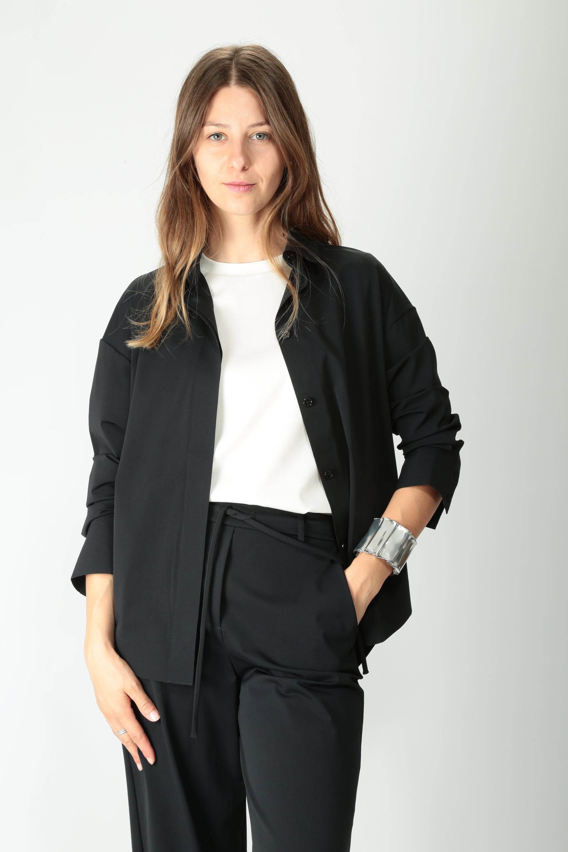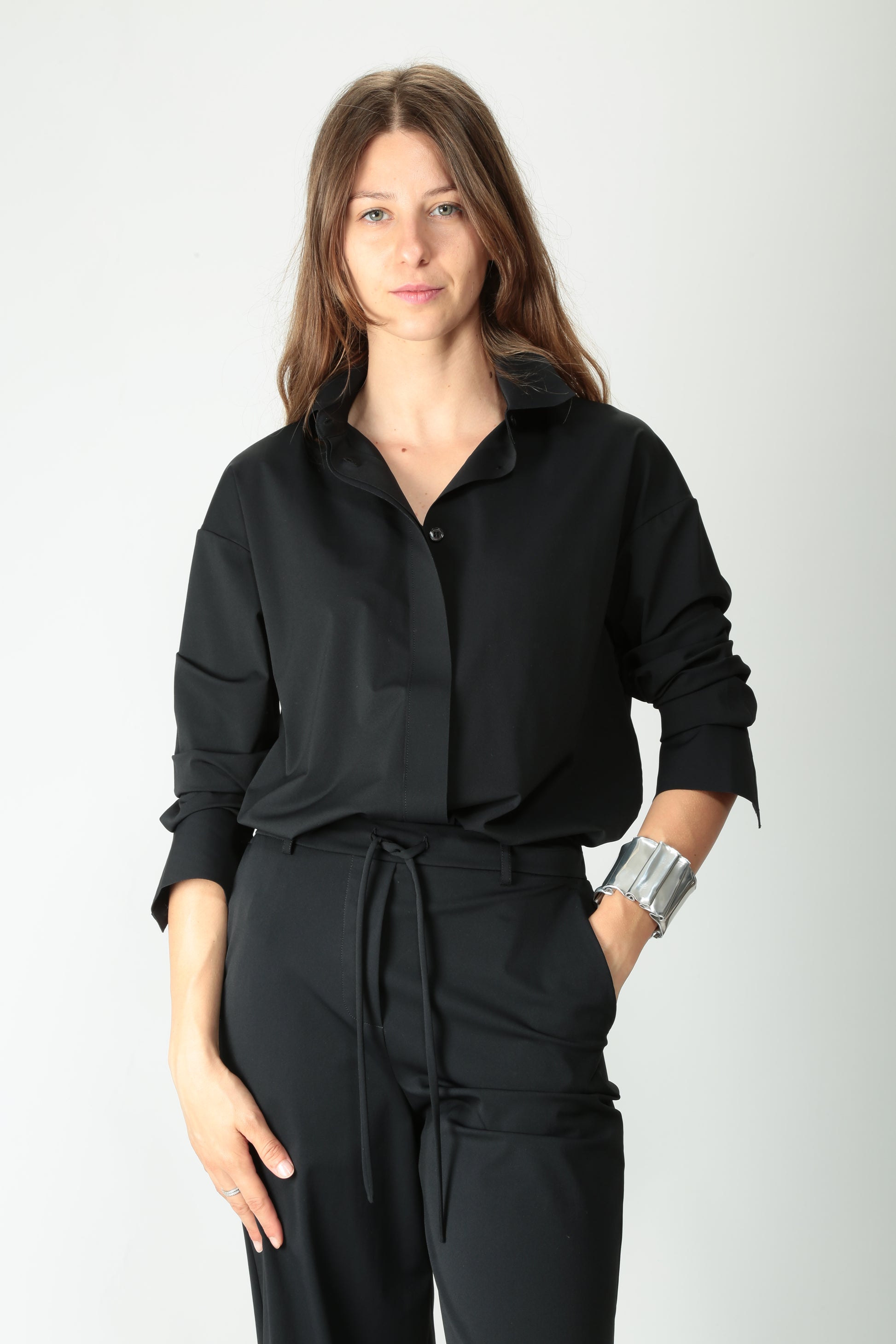 Camicia realizzata in morbido jersey tecnico. Collo classico. spalla scesa. Manica lunga e polsini chiusi da doppio bottone. Chiusura con bottoni nascosti. Rifinita con taglio sprone sul retro. Fondo stondato a taglio laser e dettagli termonastrati. Modello oversize. Possibilità di abbinarla al suo pantalone - art. Verres -