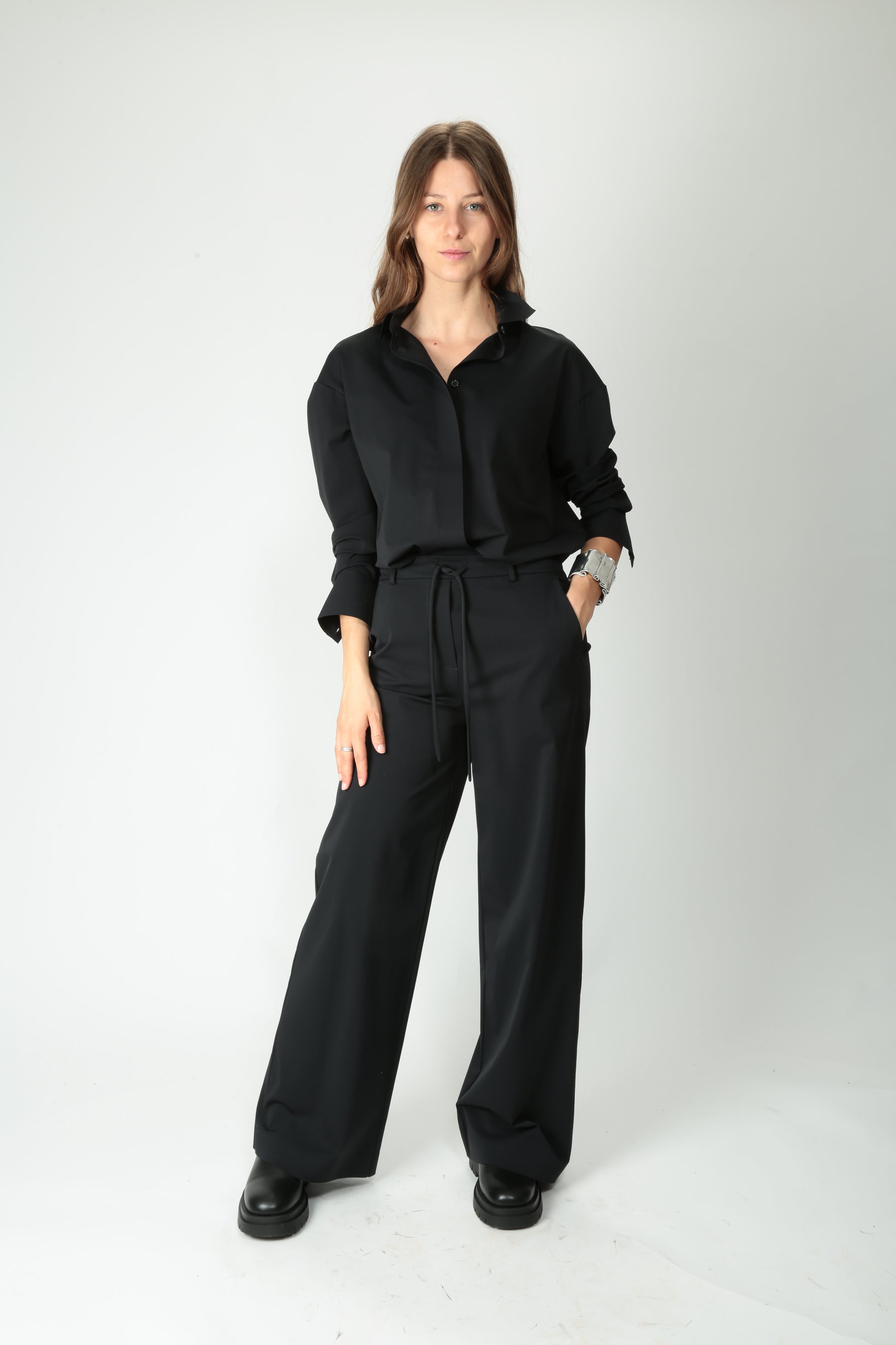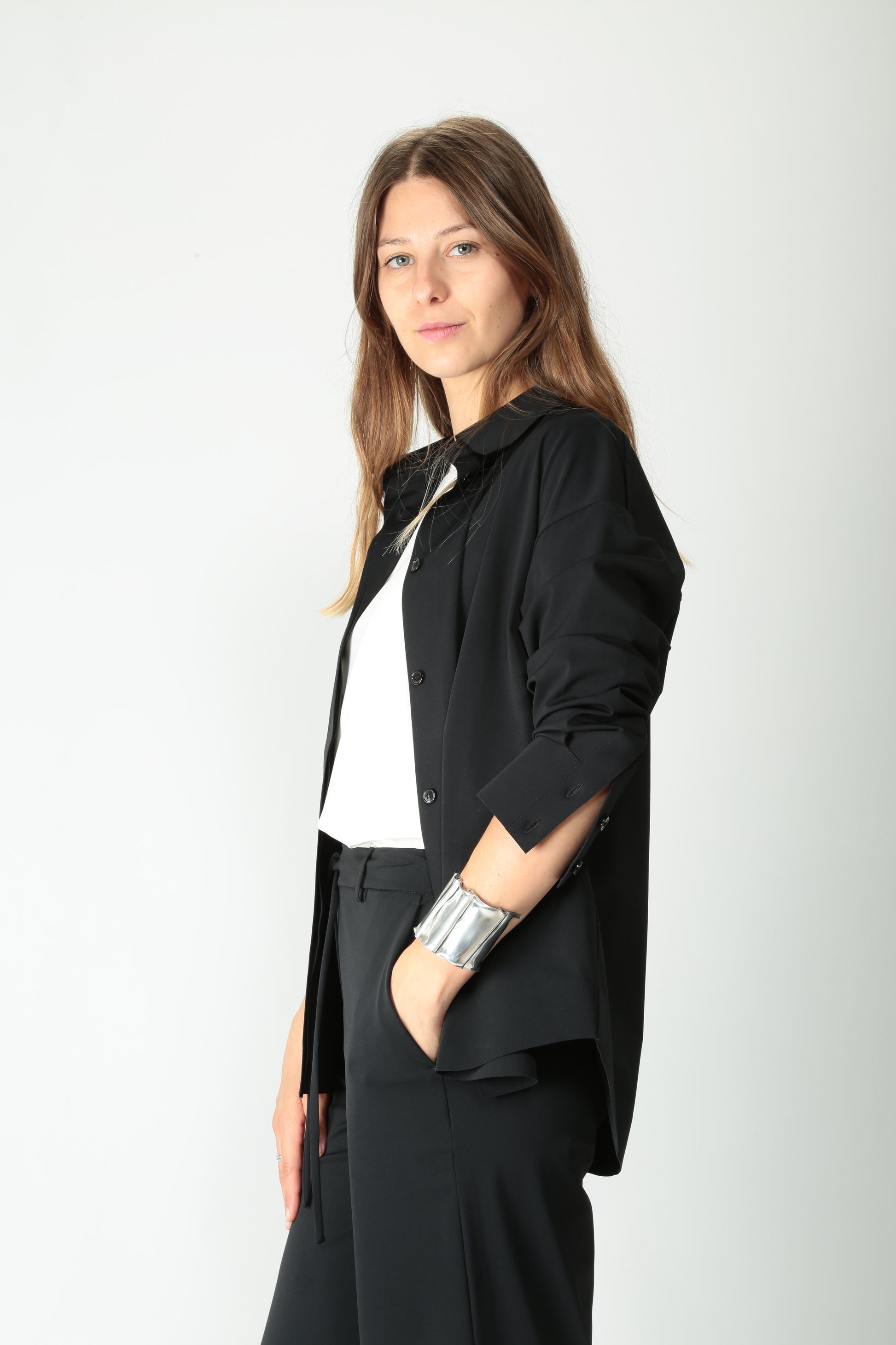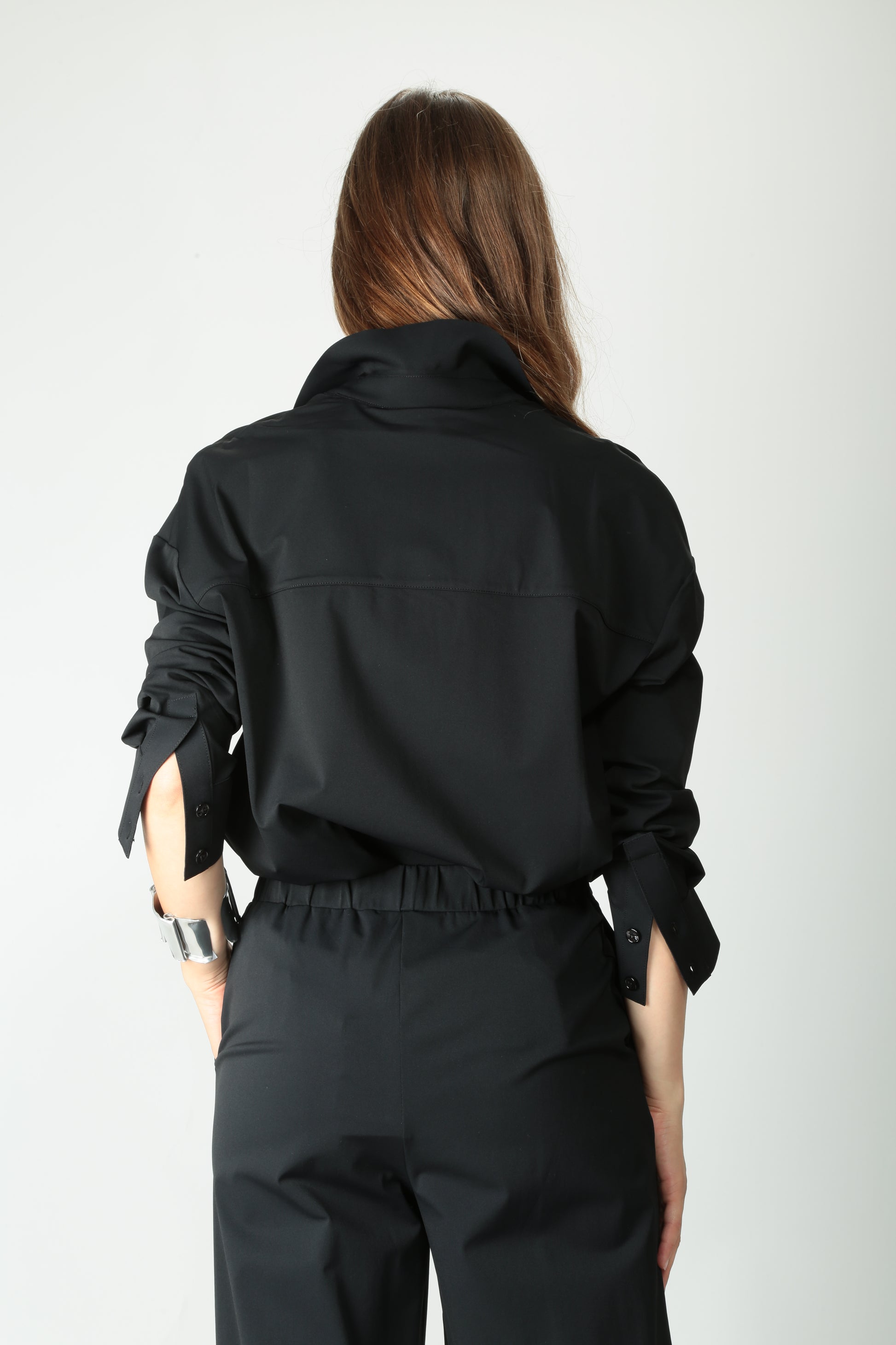 Camicia realizzata in morbido jersey tecnico. Collo classico. spalla scesa. Manica lunga e polsini chiusi da doppio bottone. Chiusura con bottoni nascosti. Rifinita con taglio sprone sul retro. Fondo stondato a taglio laser e dettagli termonastrati. Modello oversize. Possibilità di abbinarla al suo pantalone - art. Verres -