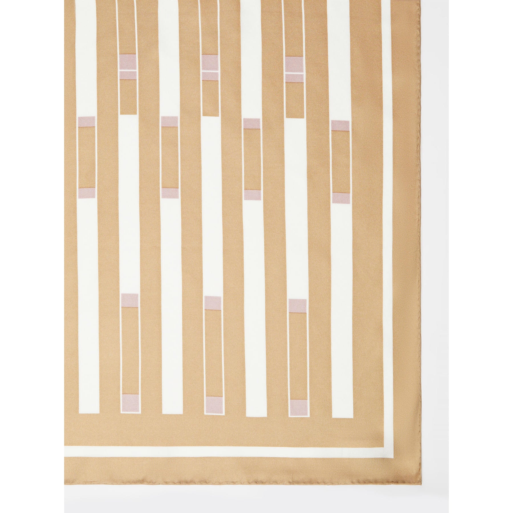 Foulard in seta. Realizzato su fondo ocra con disegno geometrico panna e lilla.