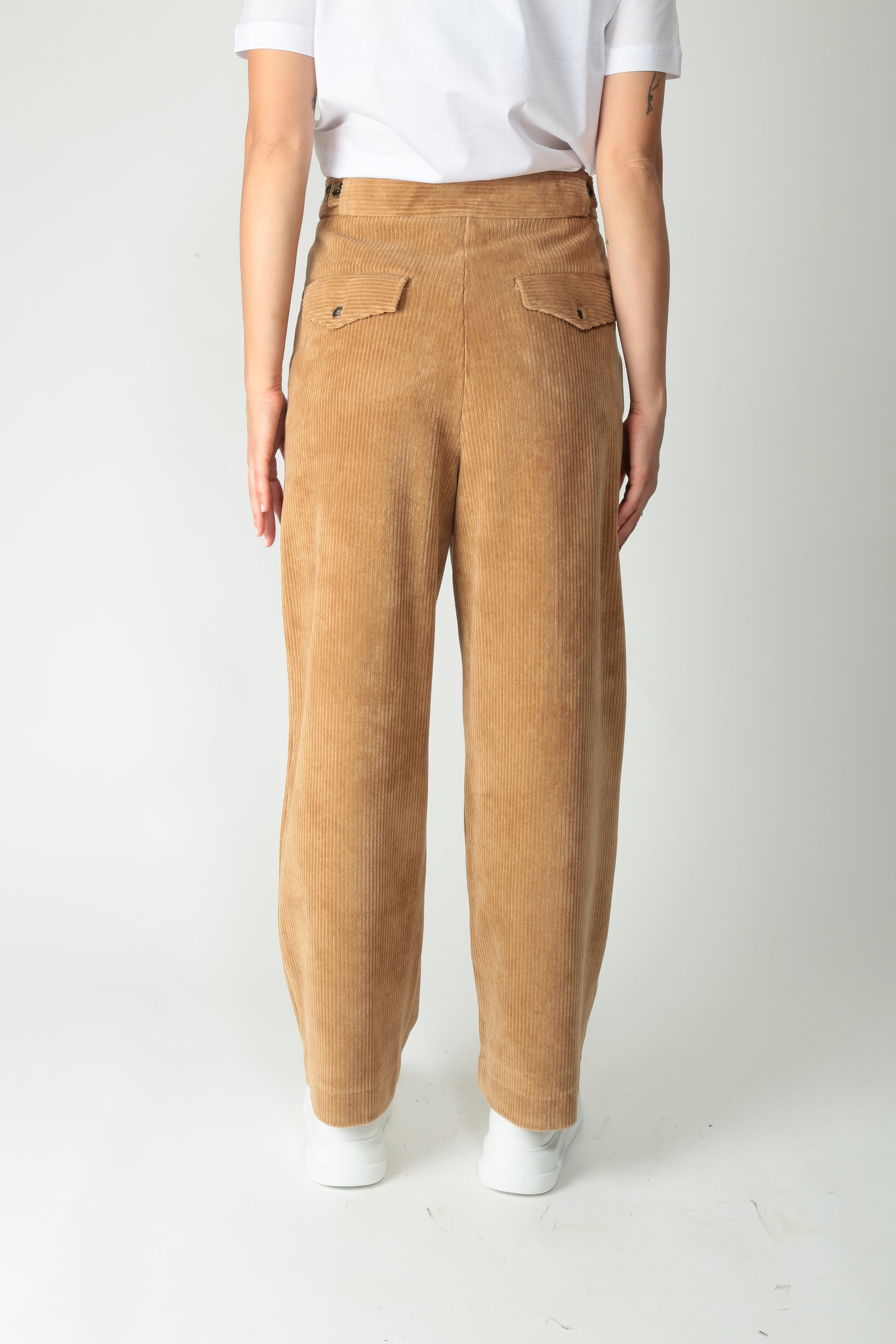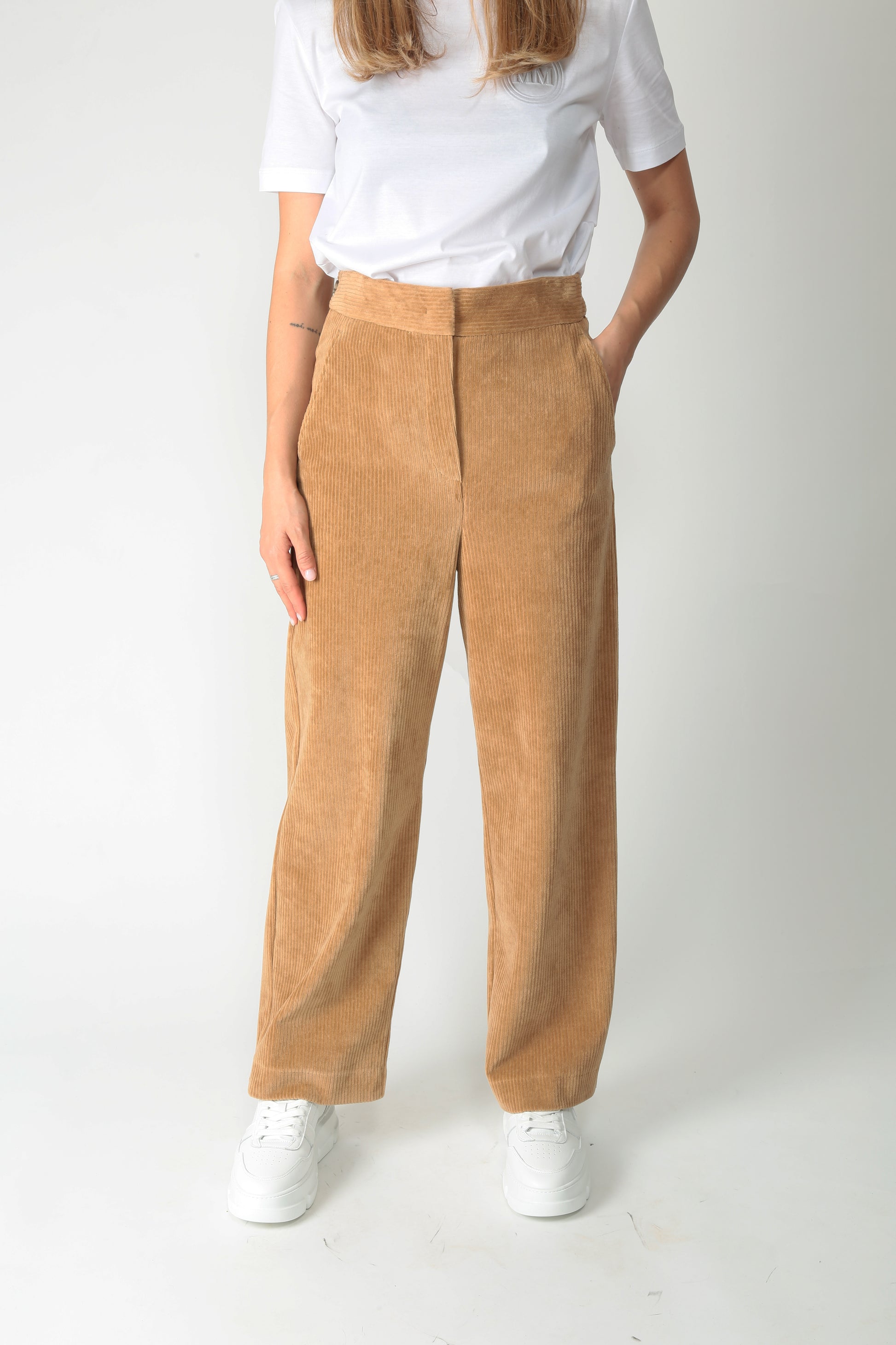Pantalone realizzato in velluto a coste. Fascione in vita con cinturino regolabile nella parte posteriore. Chiusura con gancio e zip. Tasche a filetto sul fianco e con patta e bottone nella parte posteriore. Gamba morbida e dritta. Disponibile anche nel colore bianco e nero.