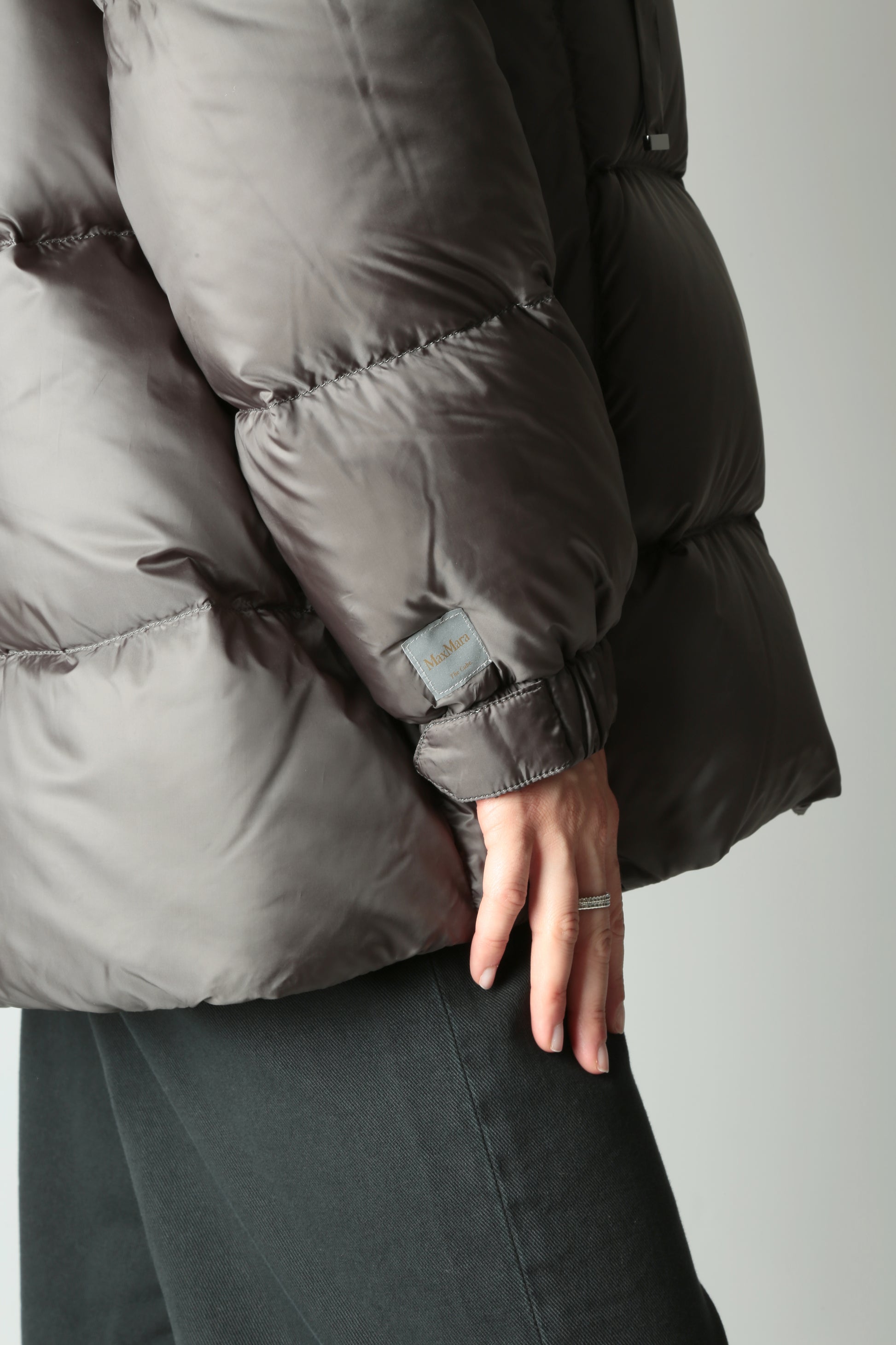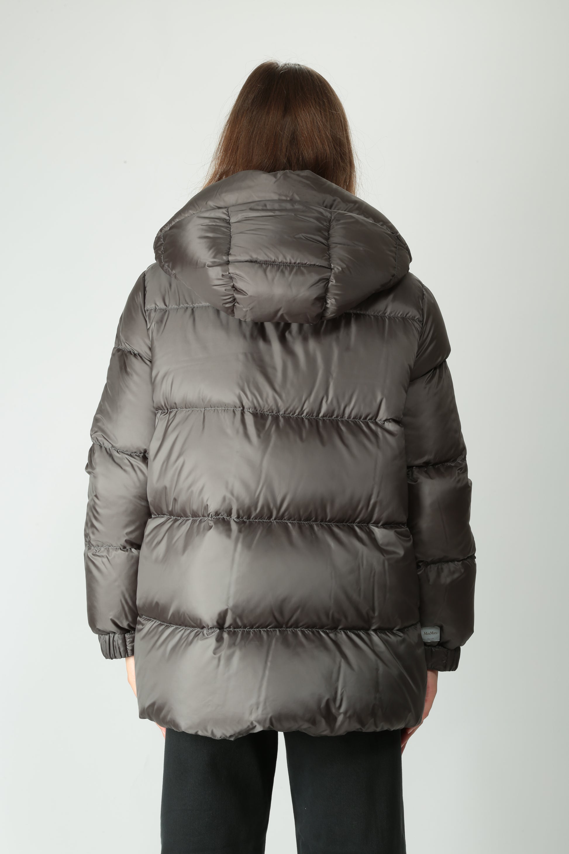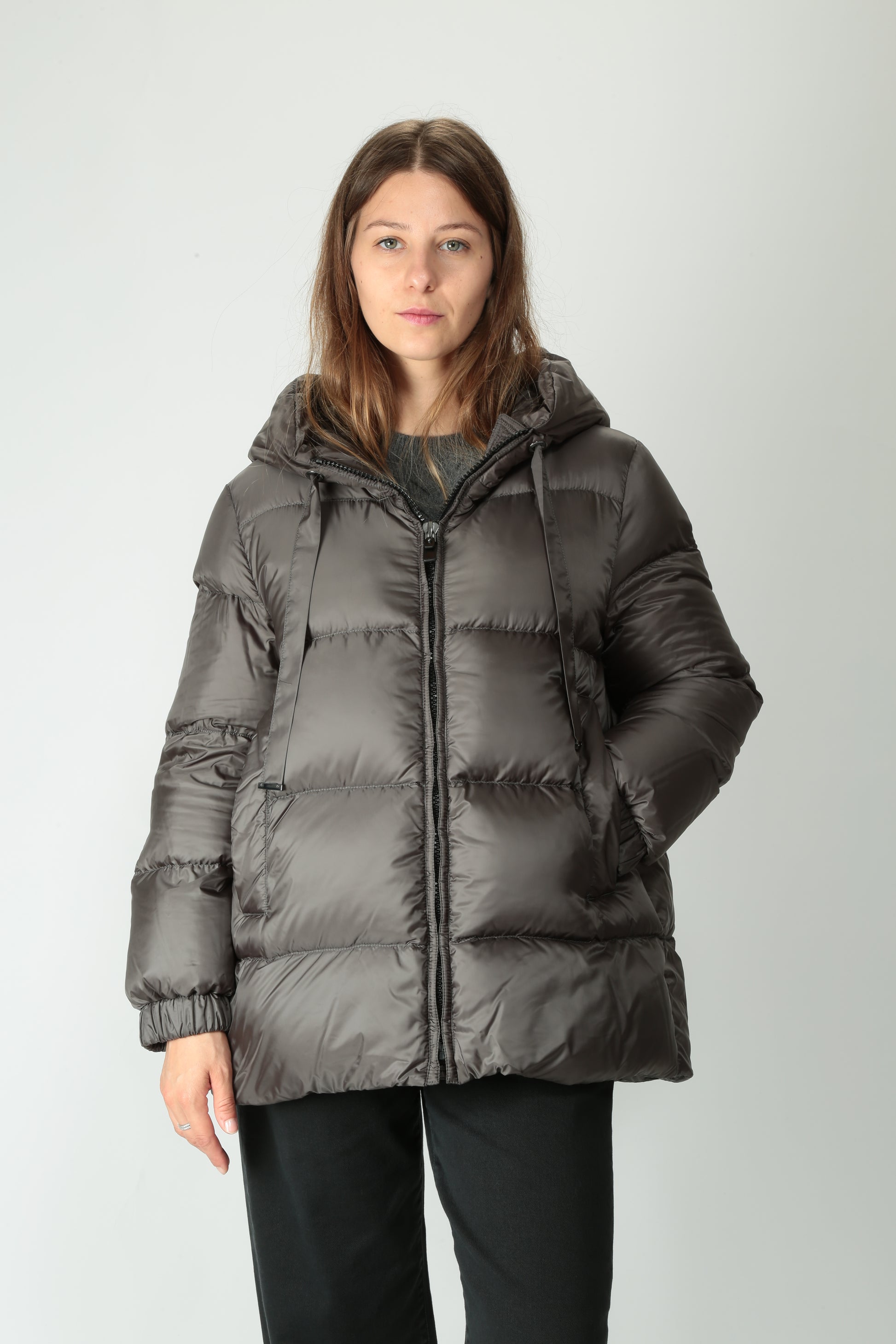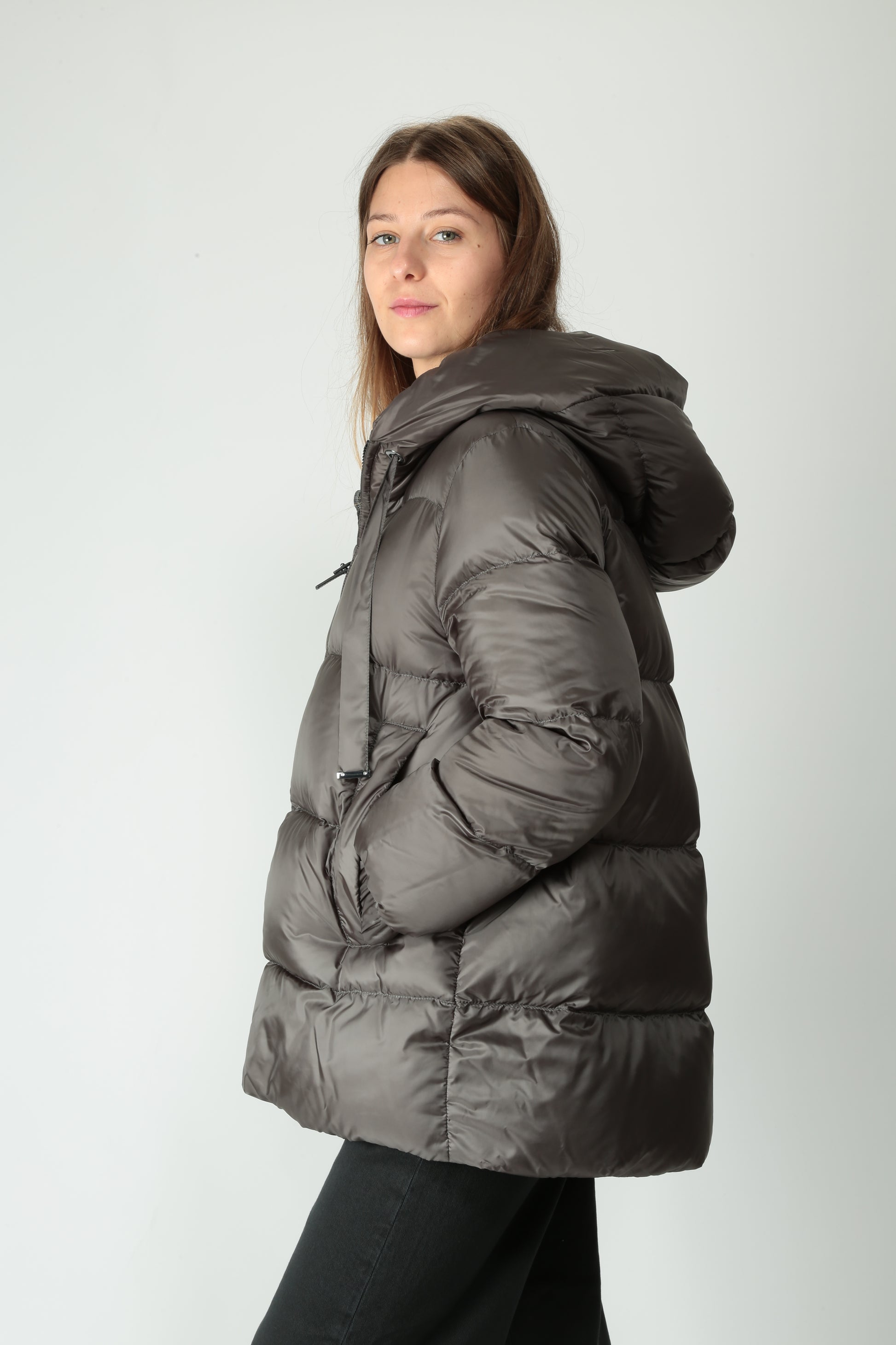 Piumino corto in piuma d'oca realizzata in tela tecnica antigoccia. Motivo trapuntato a righe orizzontali. Cappuccio con coulisse e finali in metallo. Manica lunga con polsi elasticizzati. Chiusura con zip e cursore in pelle. Tasche a filetto. Modello ampio.