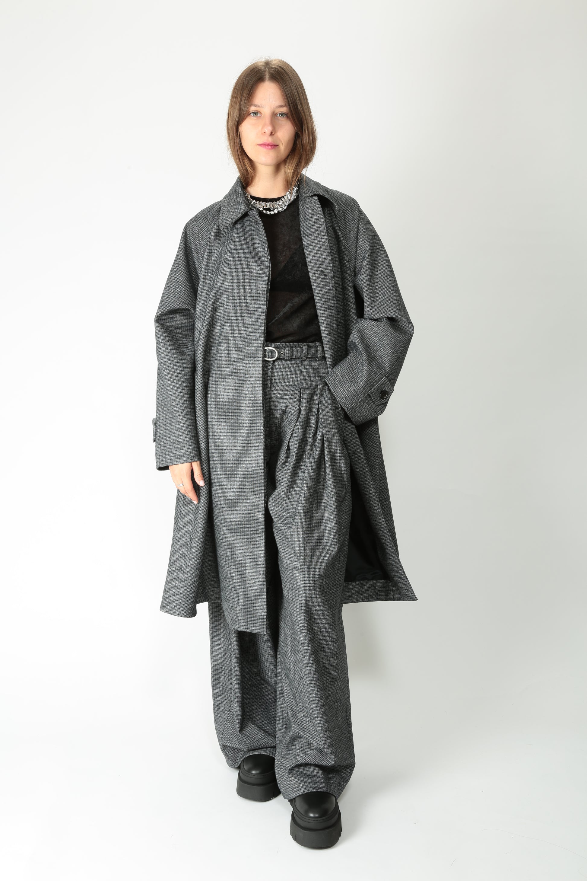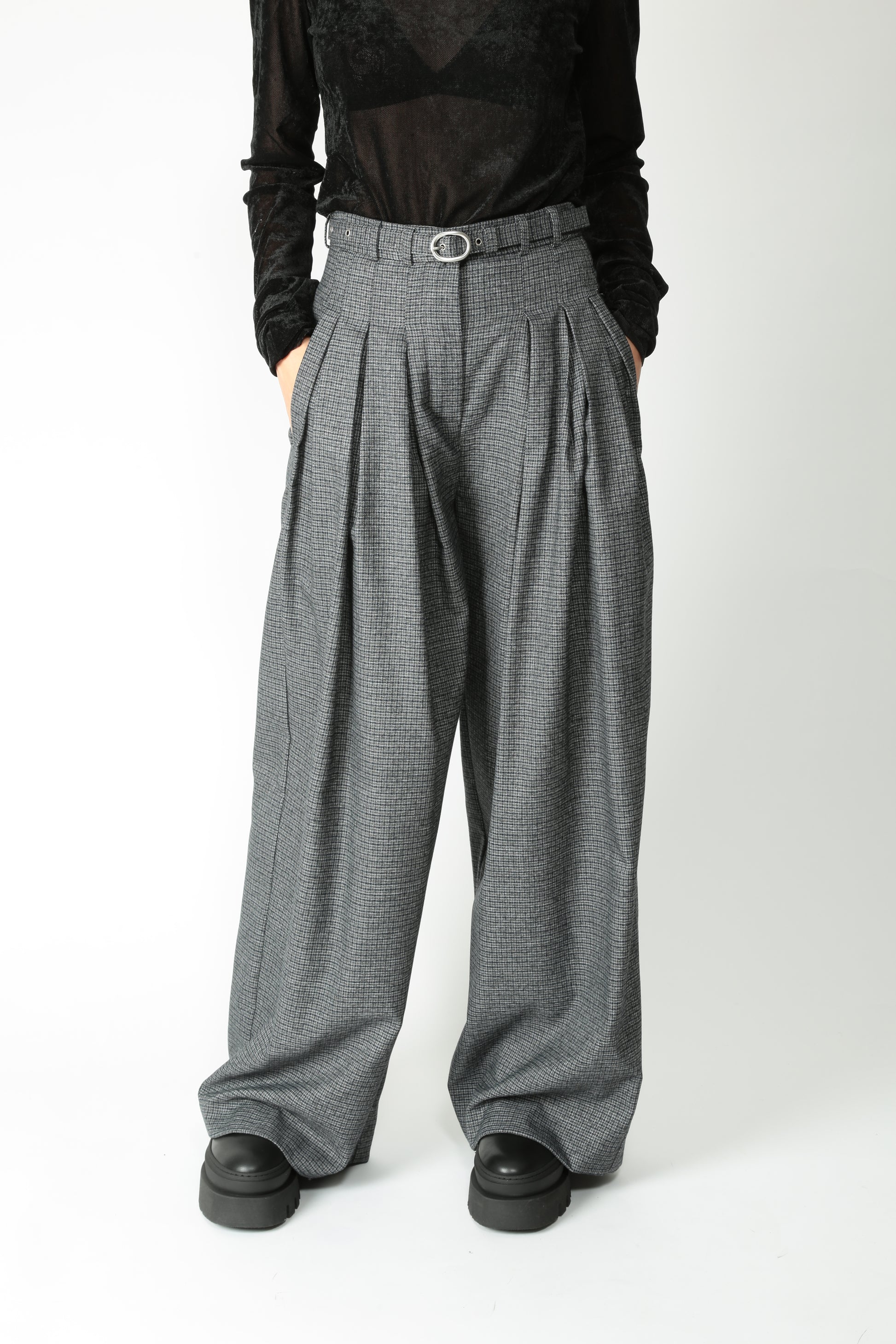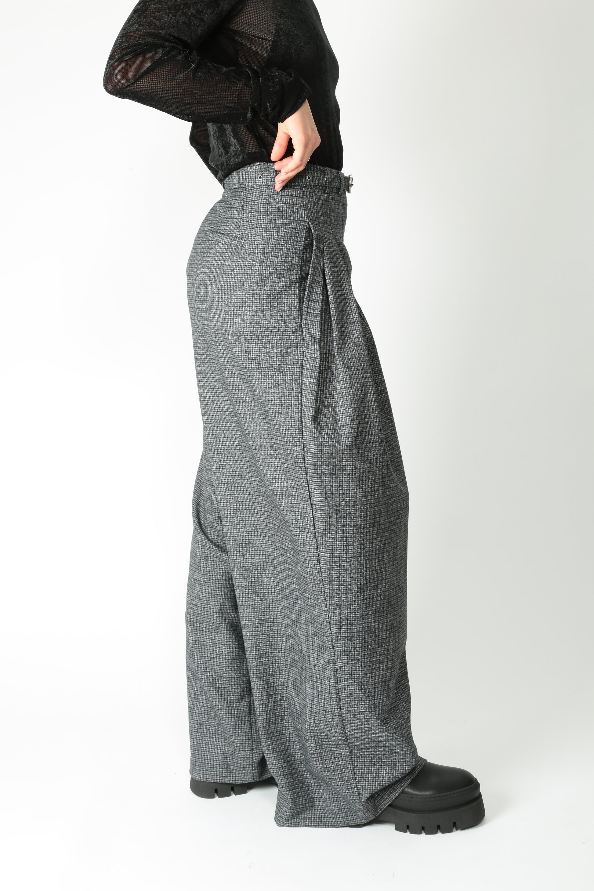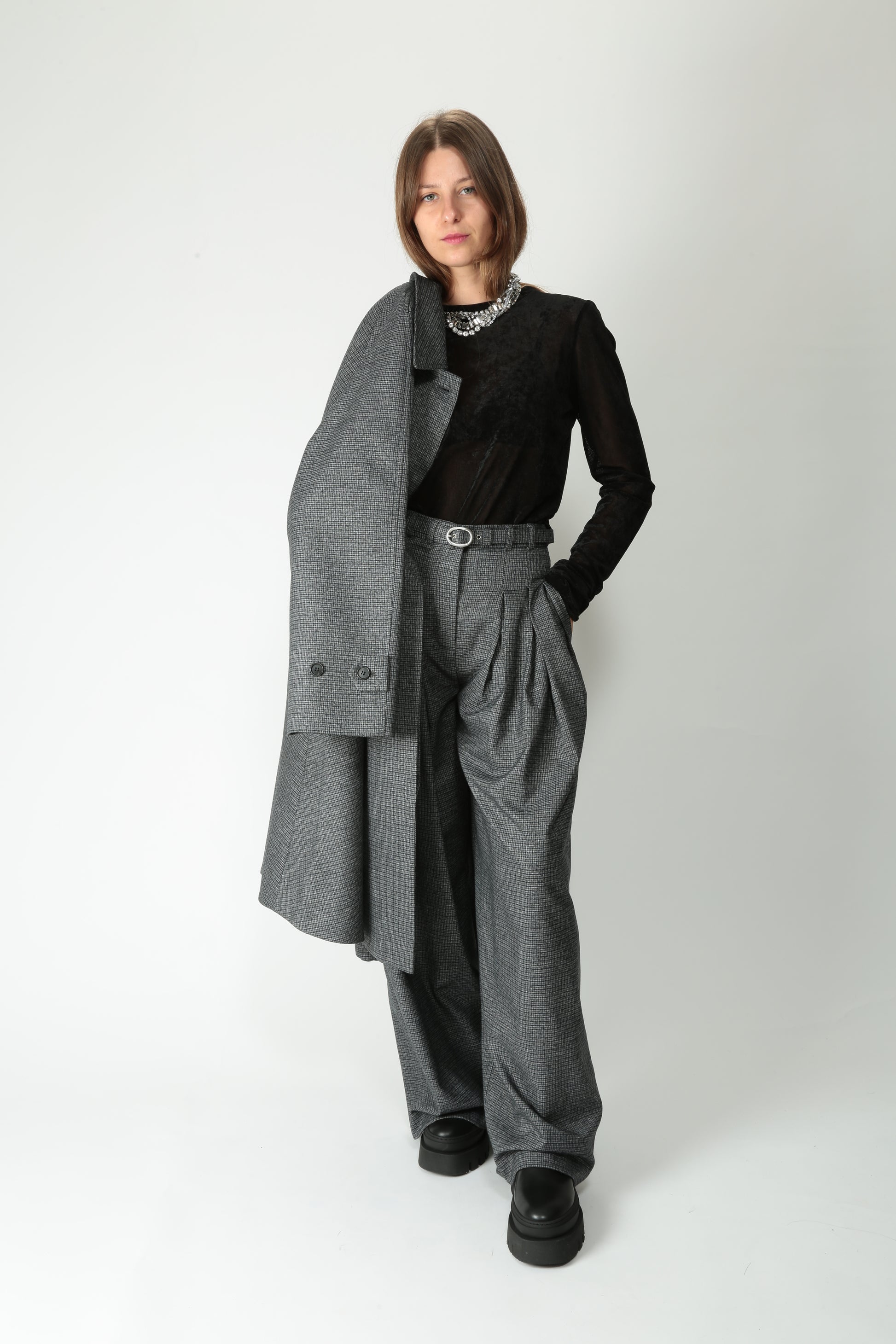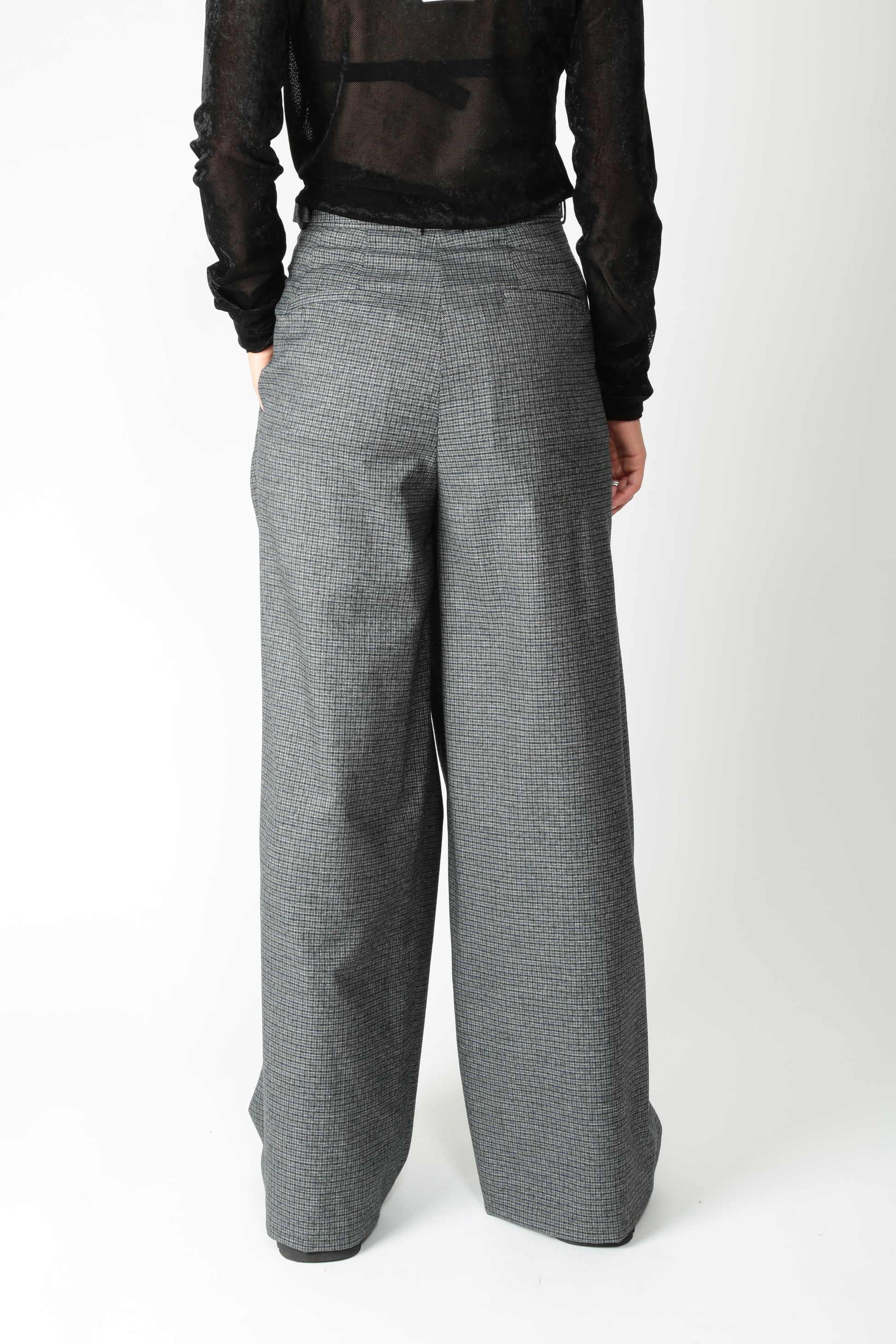 Pantalone realizzato in principe di galles nei toni del grigio e blu. Vita alta con tripla pincces. Chiusura con gancio e zip. Tasche a filetto sul fianco e nella parte posteriore. Gamba lunga e molto ampia. Cintura abbinata.