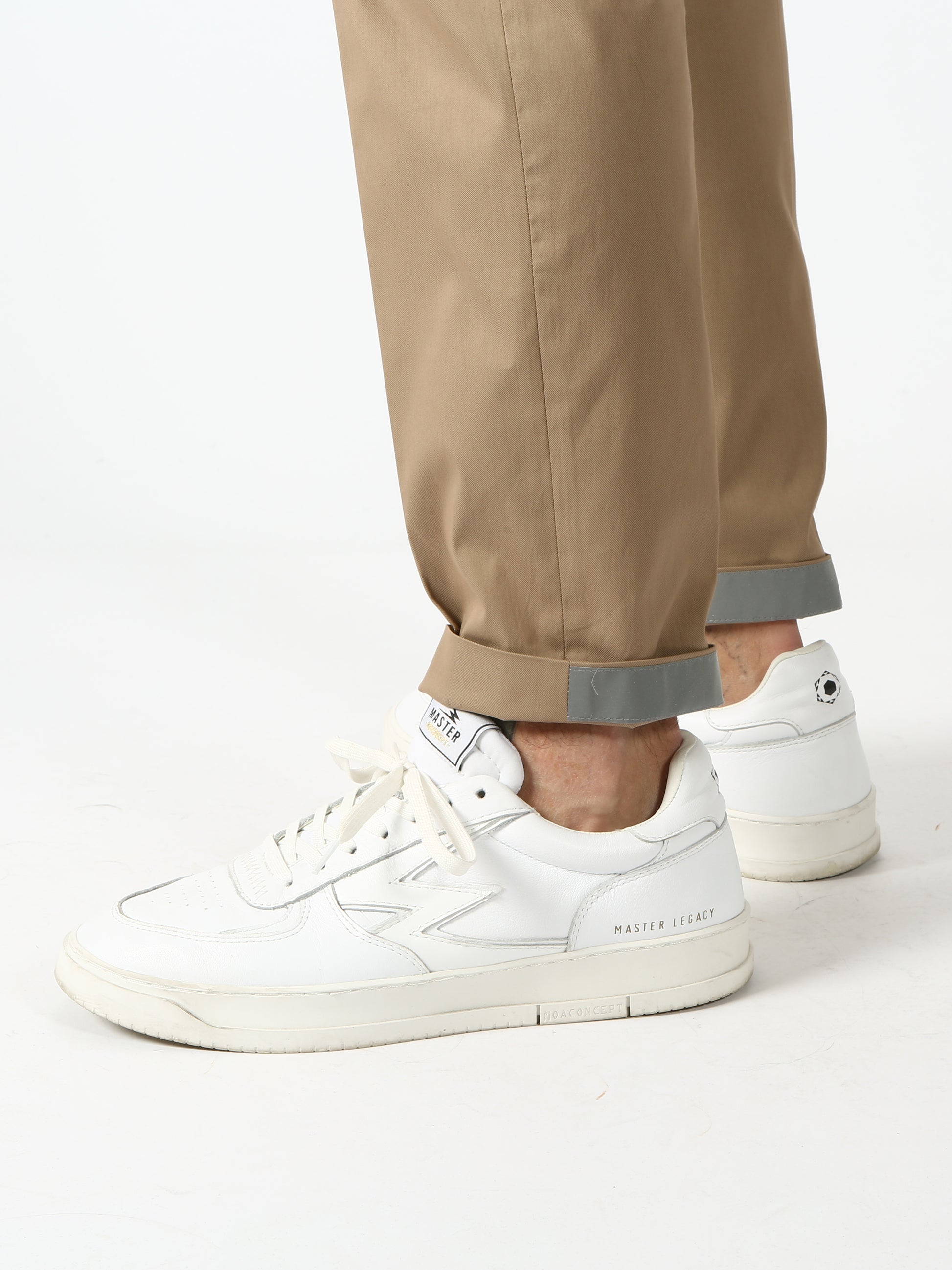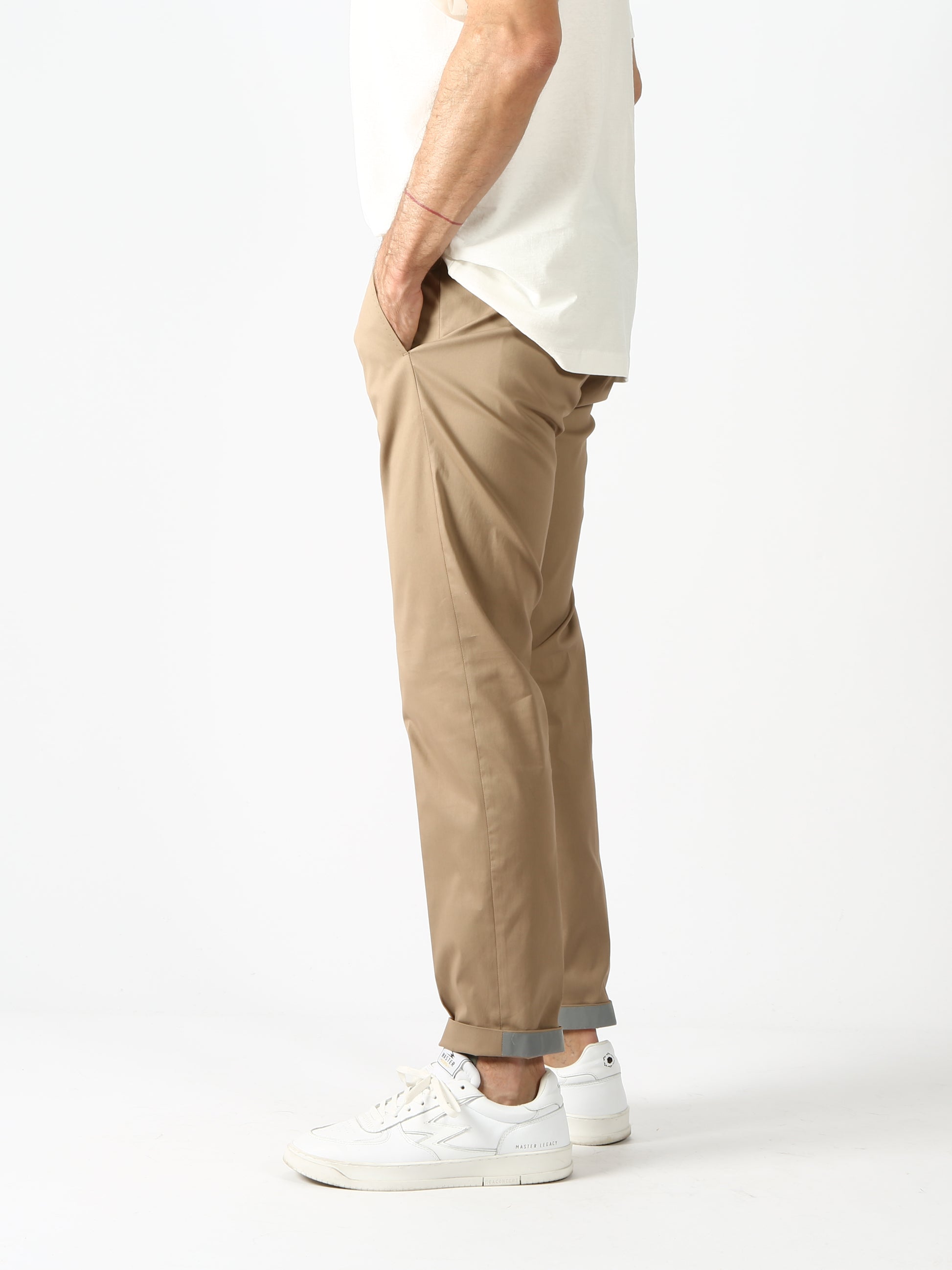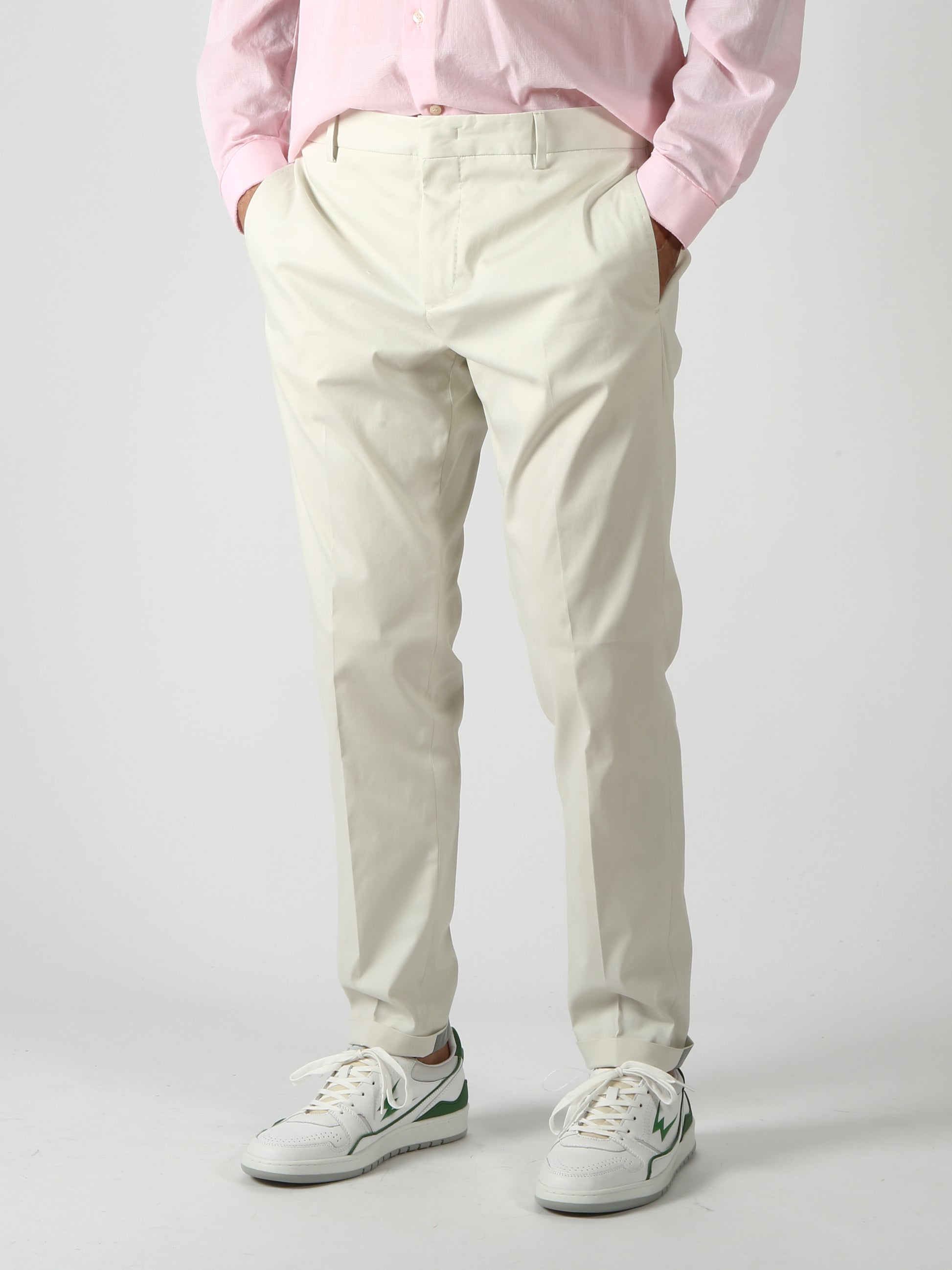 Pantalone di cotone tecnico elasticizzato. Cintura regolare con gancio. Tasche anteriori stile america. Tasche posteriori a filetto. Gamba asciutta con piega stirata davanti e dietro. Banda catarifrangente alla caviglia. Fondo 16 cm.