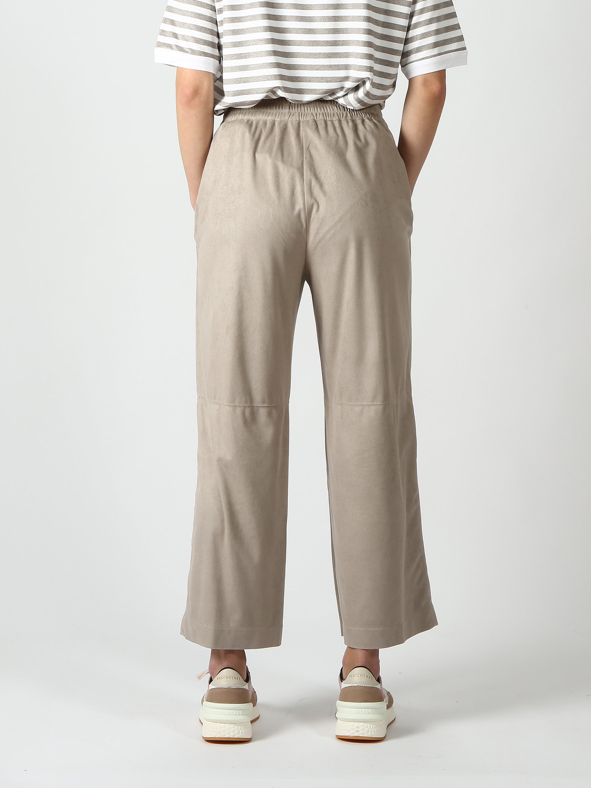 Pantalone effetto scamosciato. Elastico in vita con coulisse. Tasche a filetto sul fianco. Gamba morbida. Fondo 24 cm. Made in Italy.