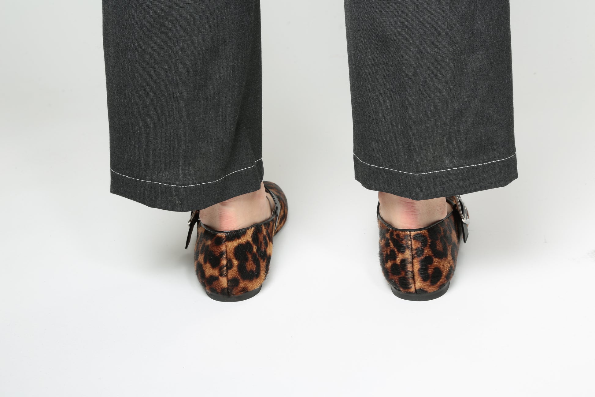 Ballerina in cavallino leopardata. Punta tonda. Cinturino alto sul collo del piede in pelle nera. Tacco 0,8 cm.