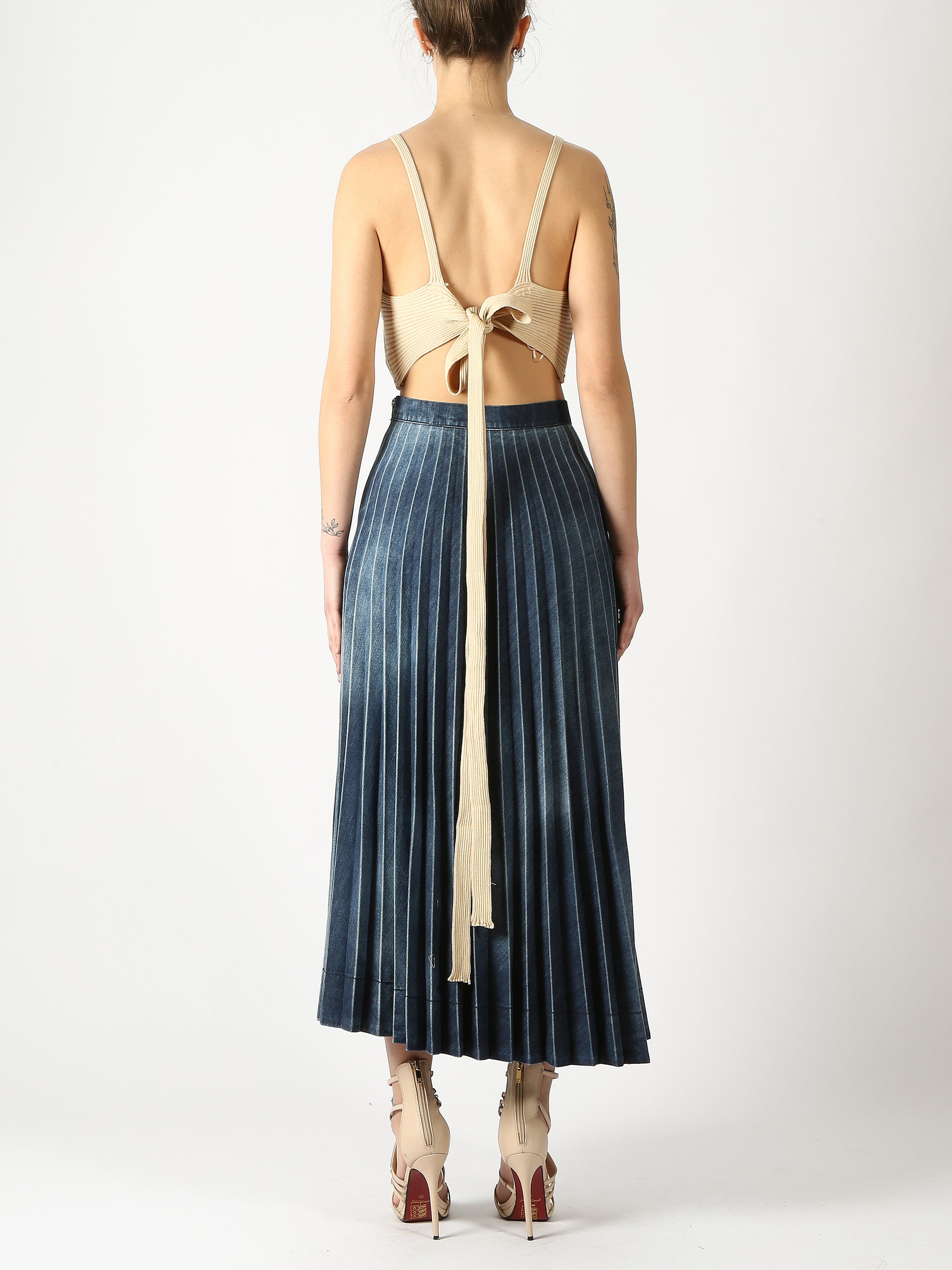 Top in maglia con applicazione di rete più lavorazione in paillettes. Due lunghe strisce in maglia permettono di allacciarlo comodamente sulla parte anteriore o posteriore.
